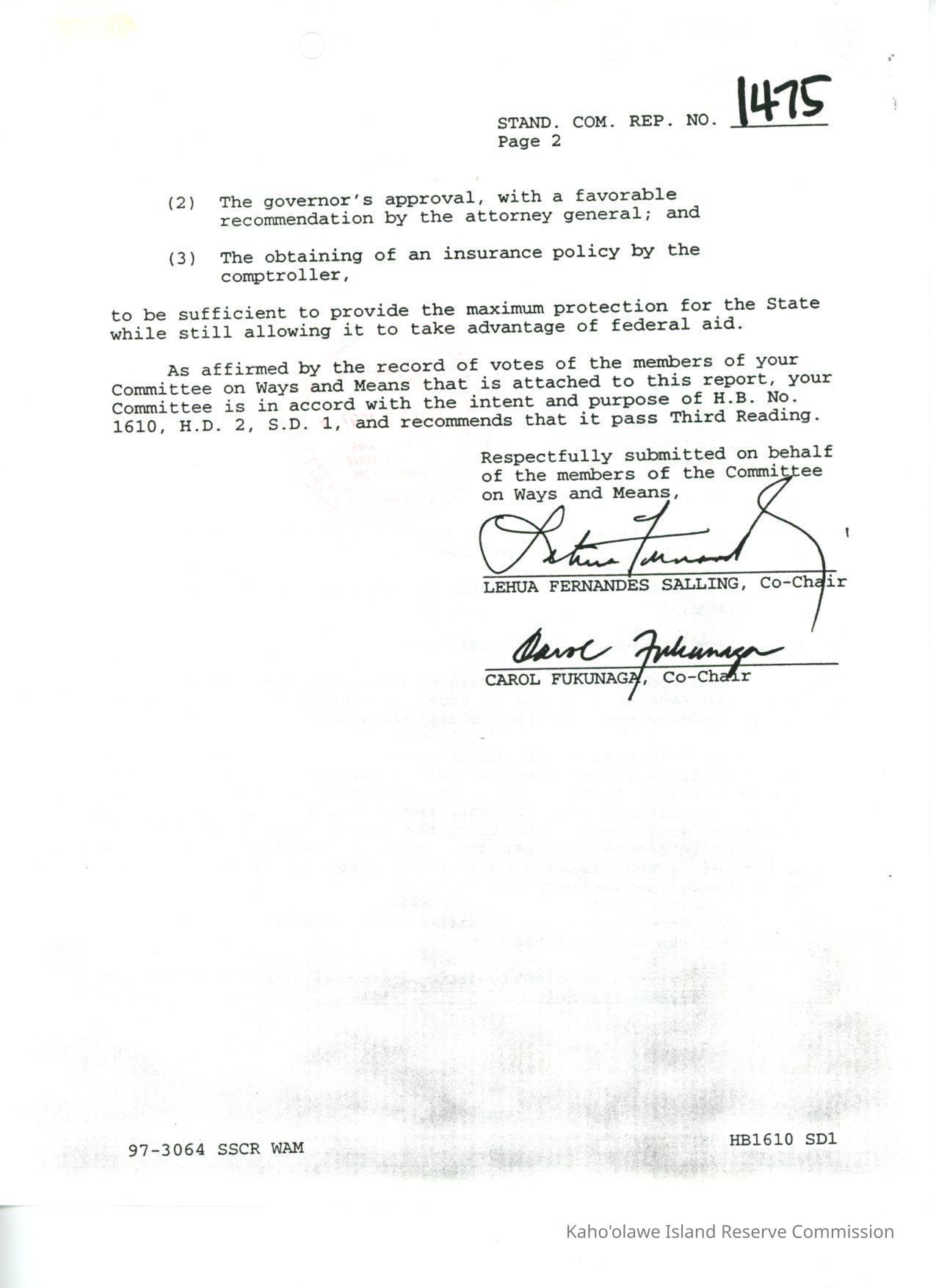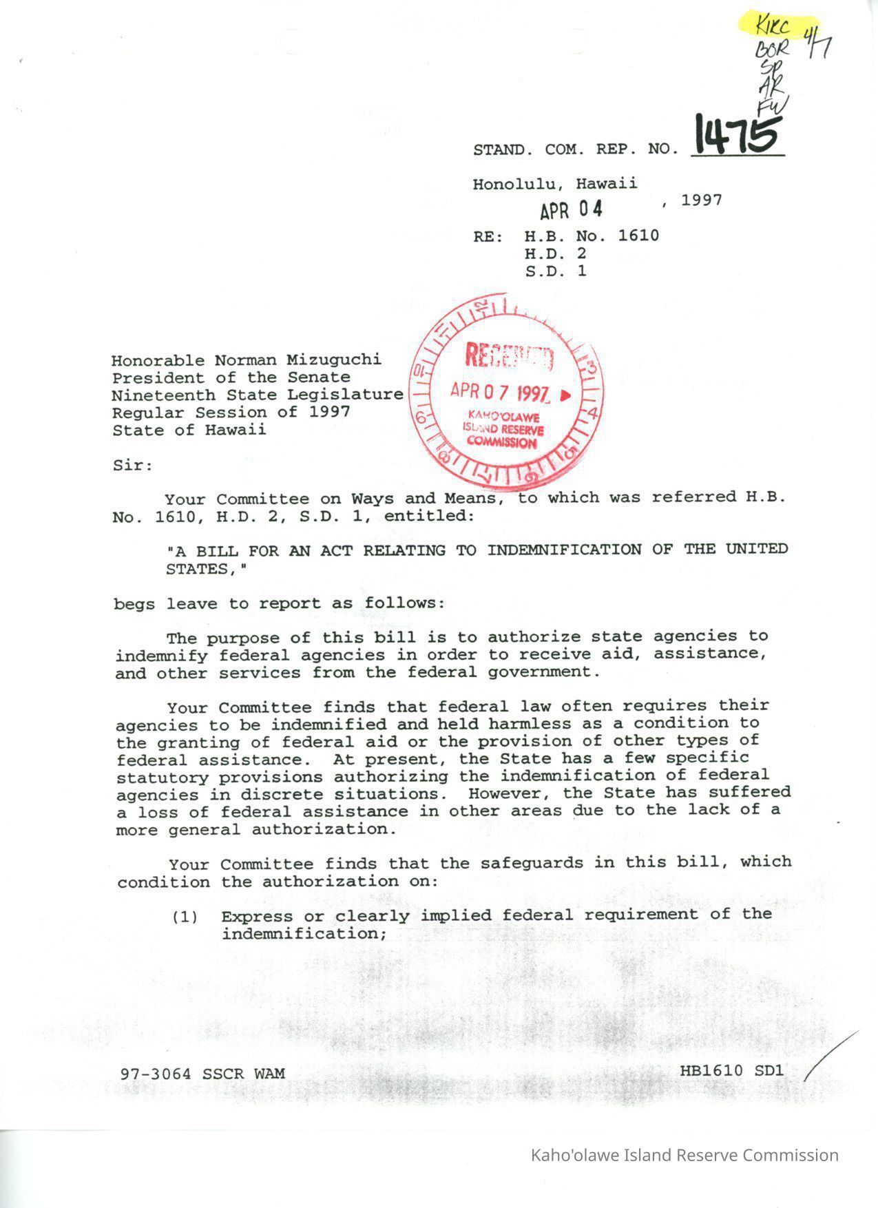 Standing Committee Report No. 1475 re: H.B. No. 1610 H.D. 2, S.D.1, "A Bill for an Act Relating to Indemnification of the United States" from Senate Committee on Ways and Means.Creator