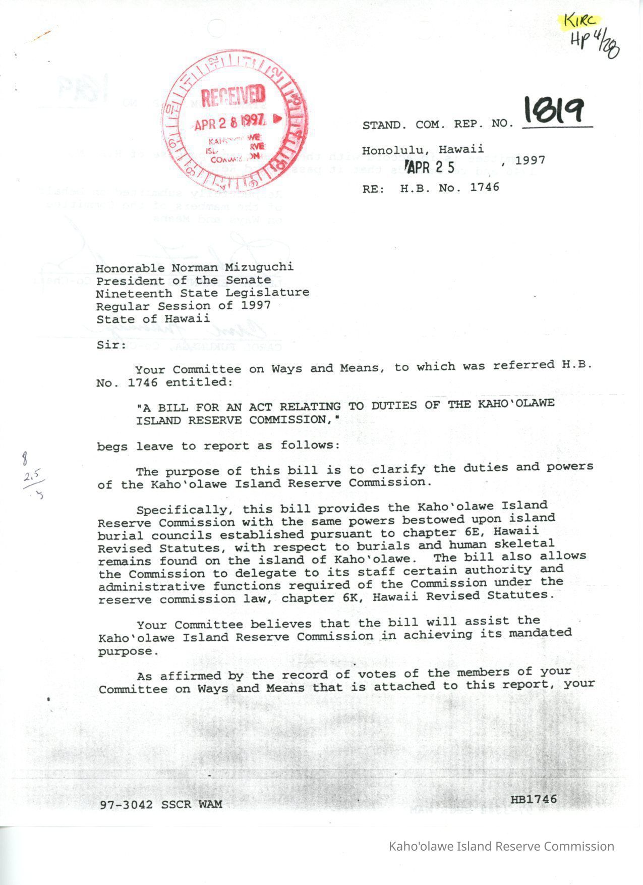 Standing Committee Report No. 1819 re: H.B. No. 1746, "A Bill for an Act Relating to Duties of the Kaho'olawe Island Reserve Commission." 2 copied pages (back to back)Creator