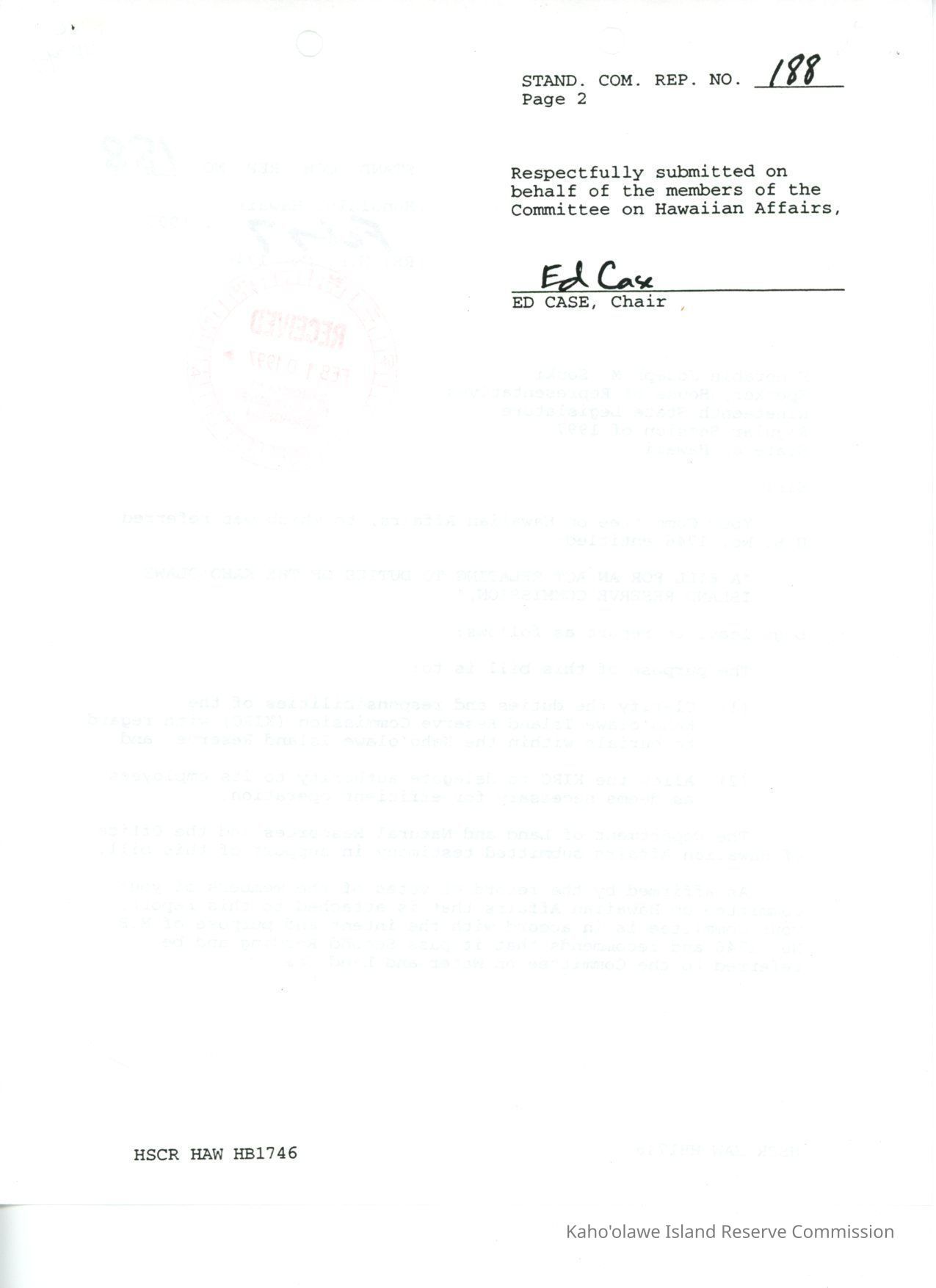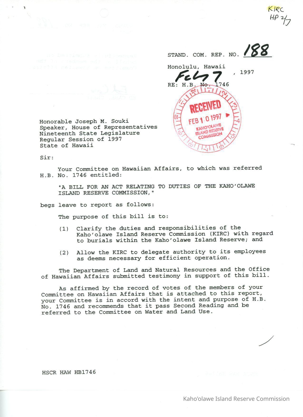 Standing Committee Report No. 188, "A Bill for an Act Relating to Duties of the Kaho'olawe Island Reserve Commission" from the House Committee on Hawaiian AffairsCreator