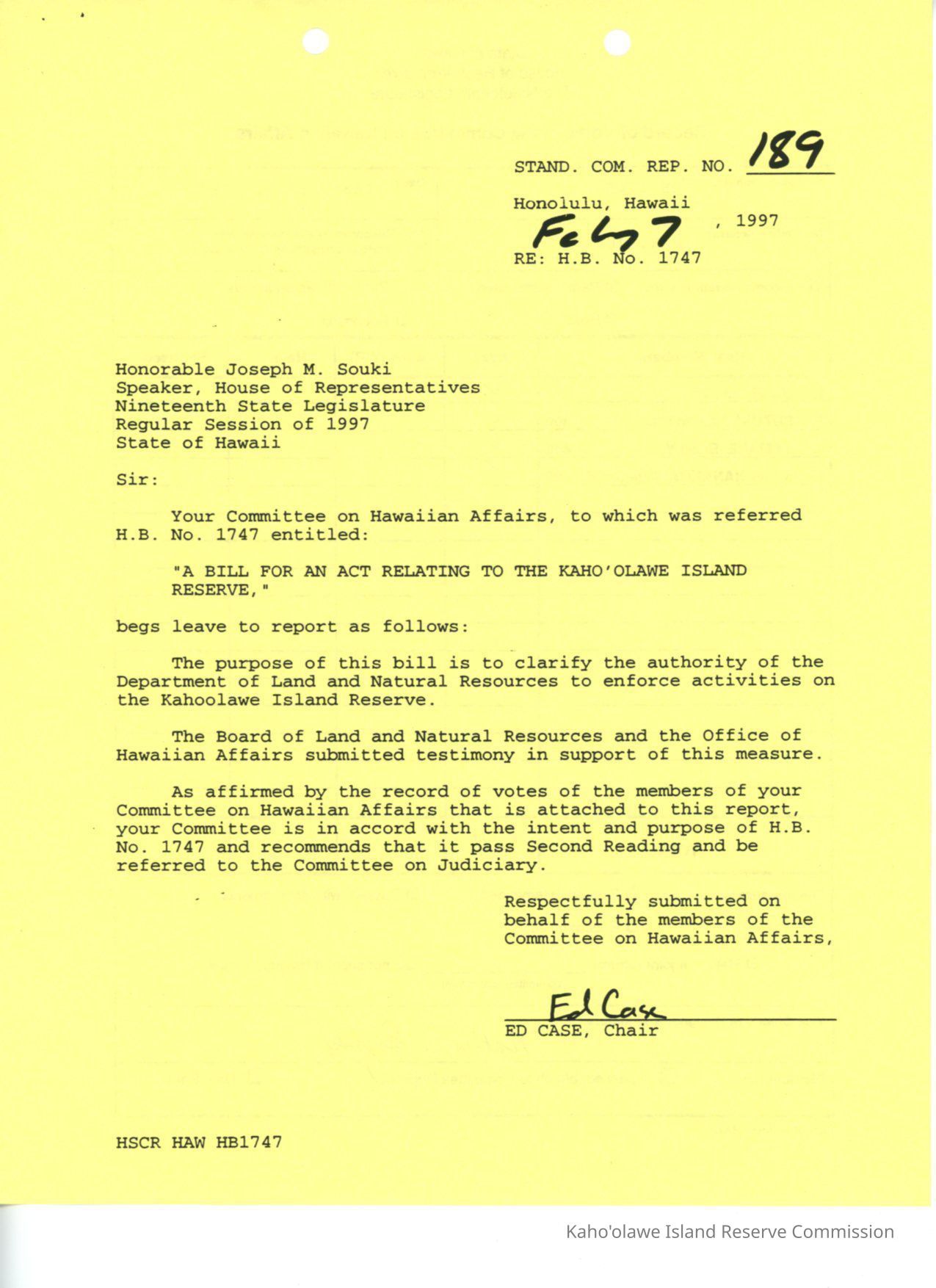 Standing Committee Report No. 189 re: H.B. No. 1747, "A Bill for an Act Relating to the Kaho'olawe Island Reserve."Creator