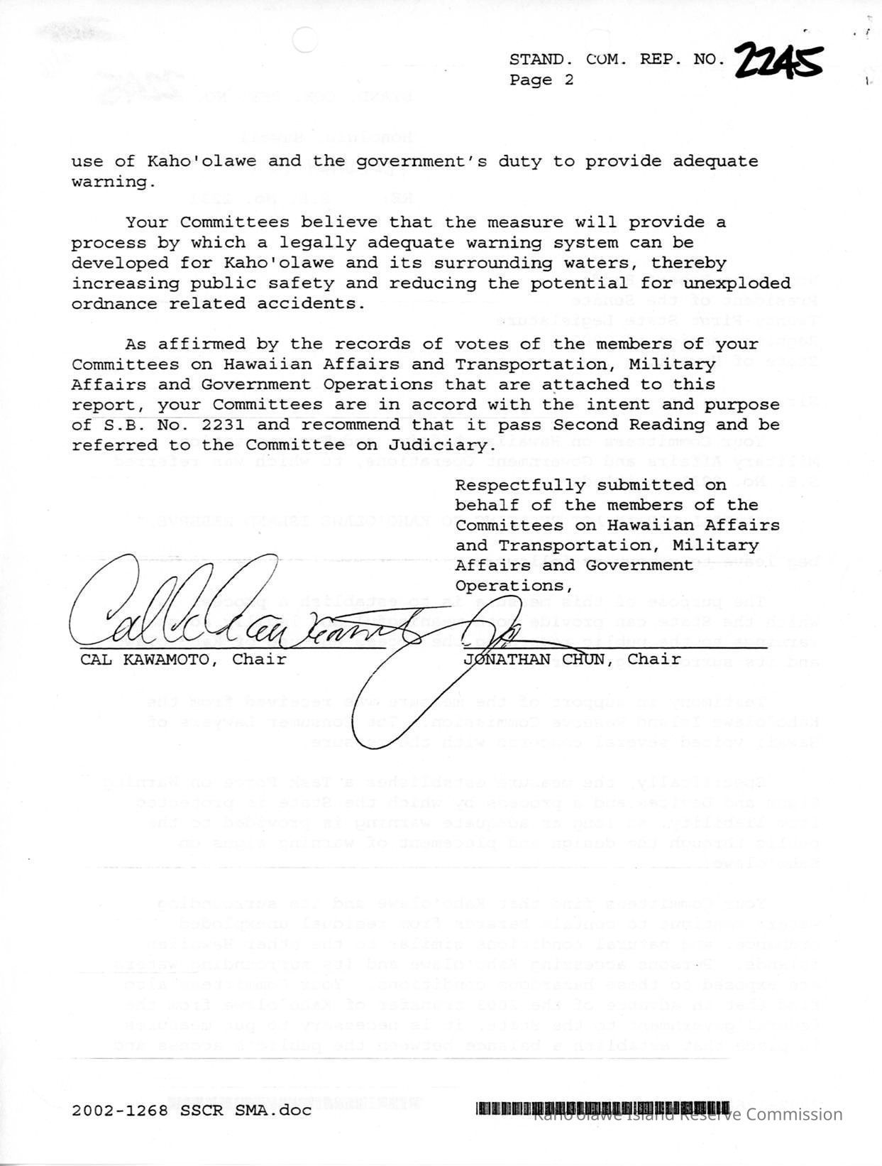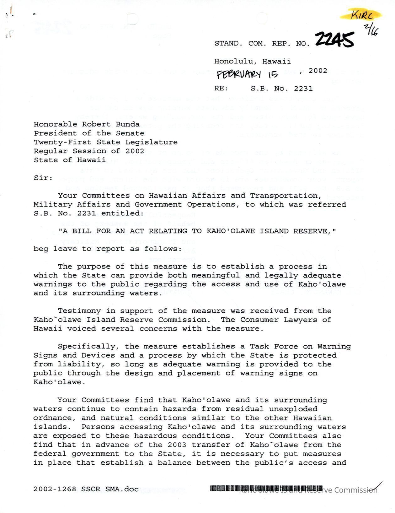 Copy of Standing Committee Report No. 2245 re: S.B. (Senate Bill) No. 2231, "A Bill For an Act Relating to Kaho'olawe Island Reserve."Creator