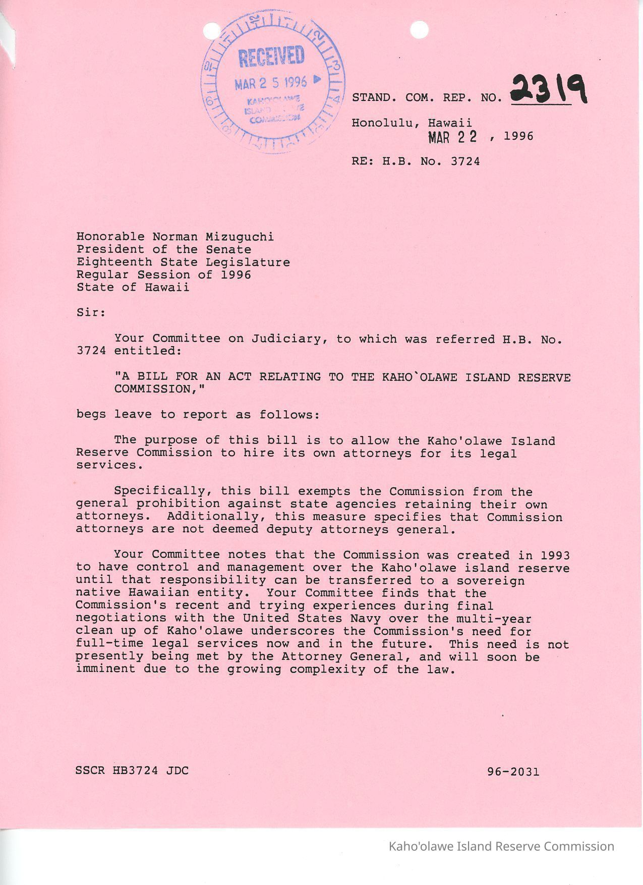 Standing Committee Report No. 2319 re: HB No. 3724 to Honorable Norman Mizuguchi, President of the Senate, from Rey Graulty, Chair, Committee on JudiciaryTwo sided copy (on pink paper) received by the Kaho'olawe Island Reserve Commission on 25 March 1996. Excerpt: "As affirmed by the record of votes of the member of your Committee on Judiciary that it pass Second Reading and be referred to the Committee on Ways and Means."Collection