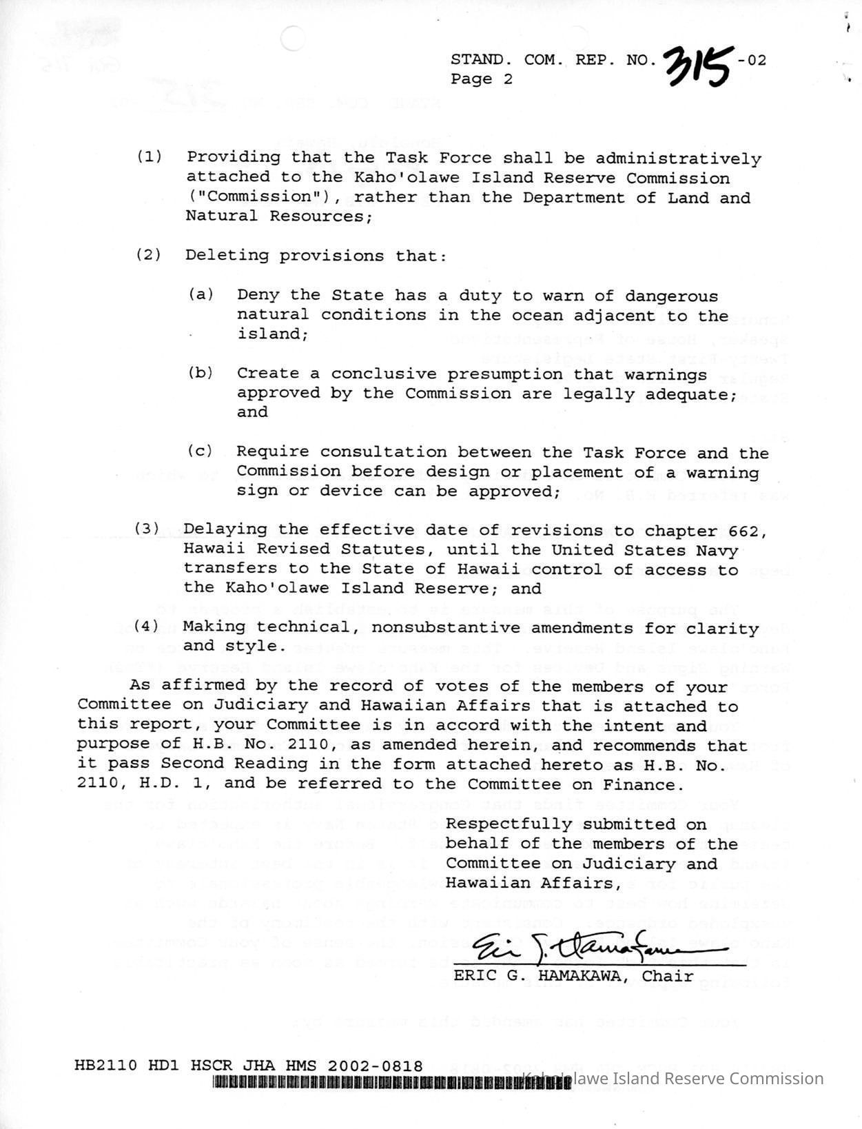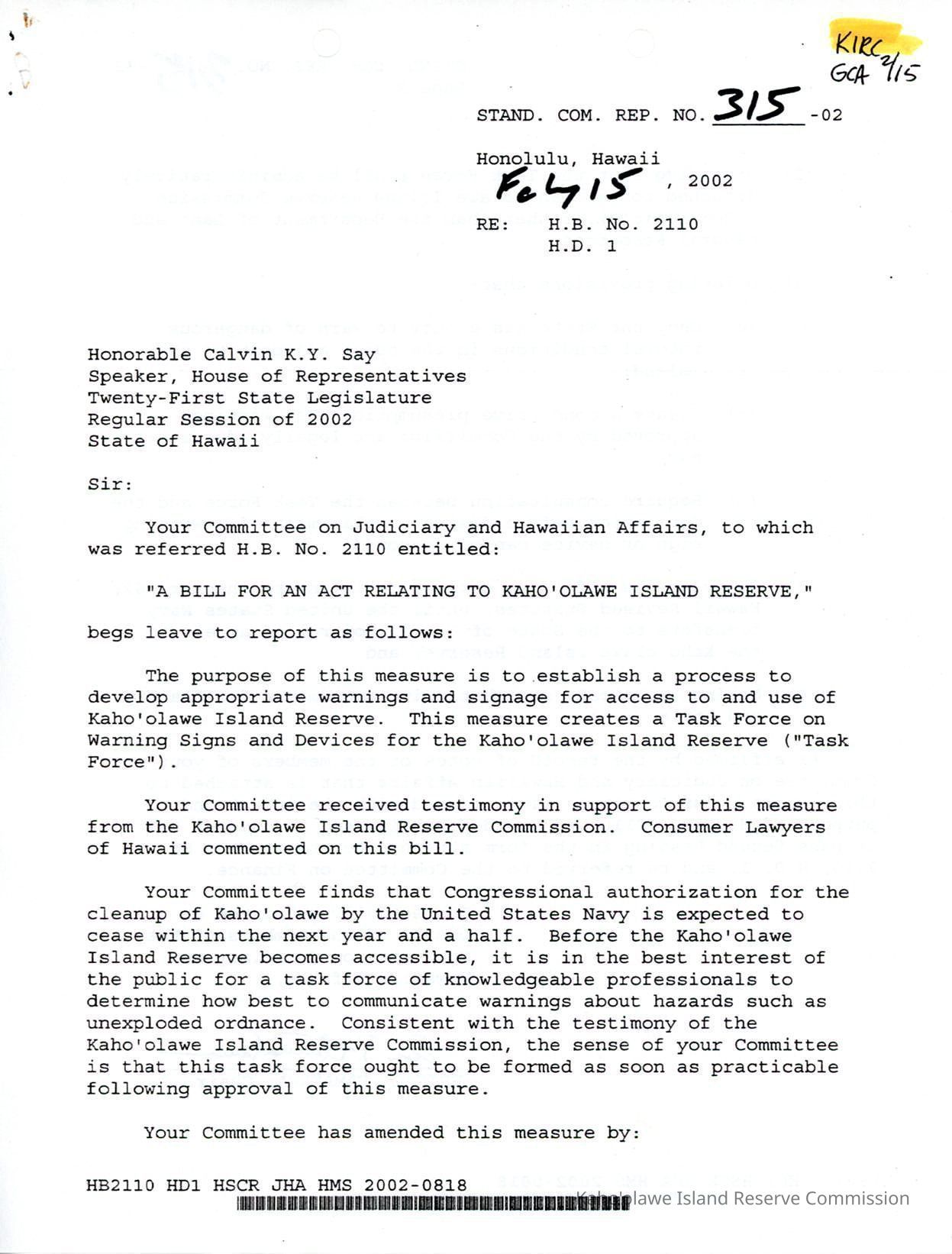 Copy of Standing Committee Report No. 315-02 re: H.B. (House Bill) No. 2110, H.D. (House Draft ) 1, "A Bill for An Act Relating to Kaho'olawe Island Reserve."Creator