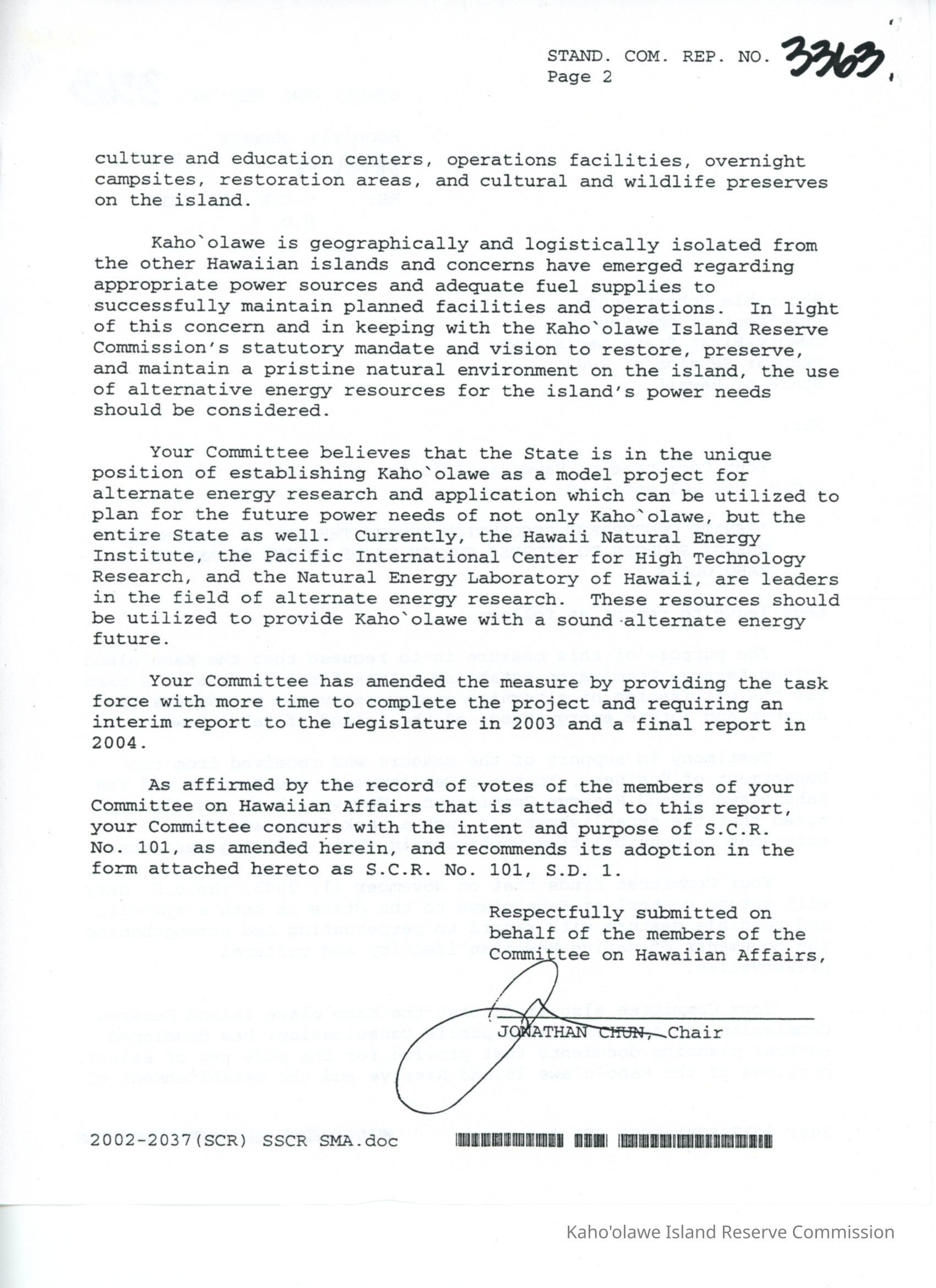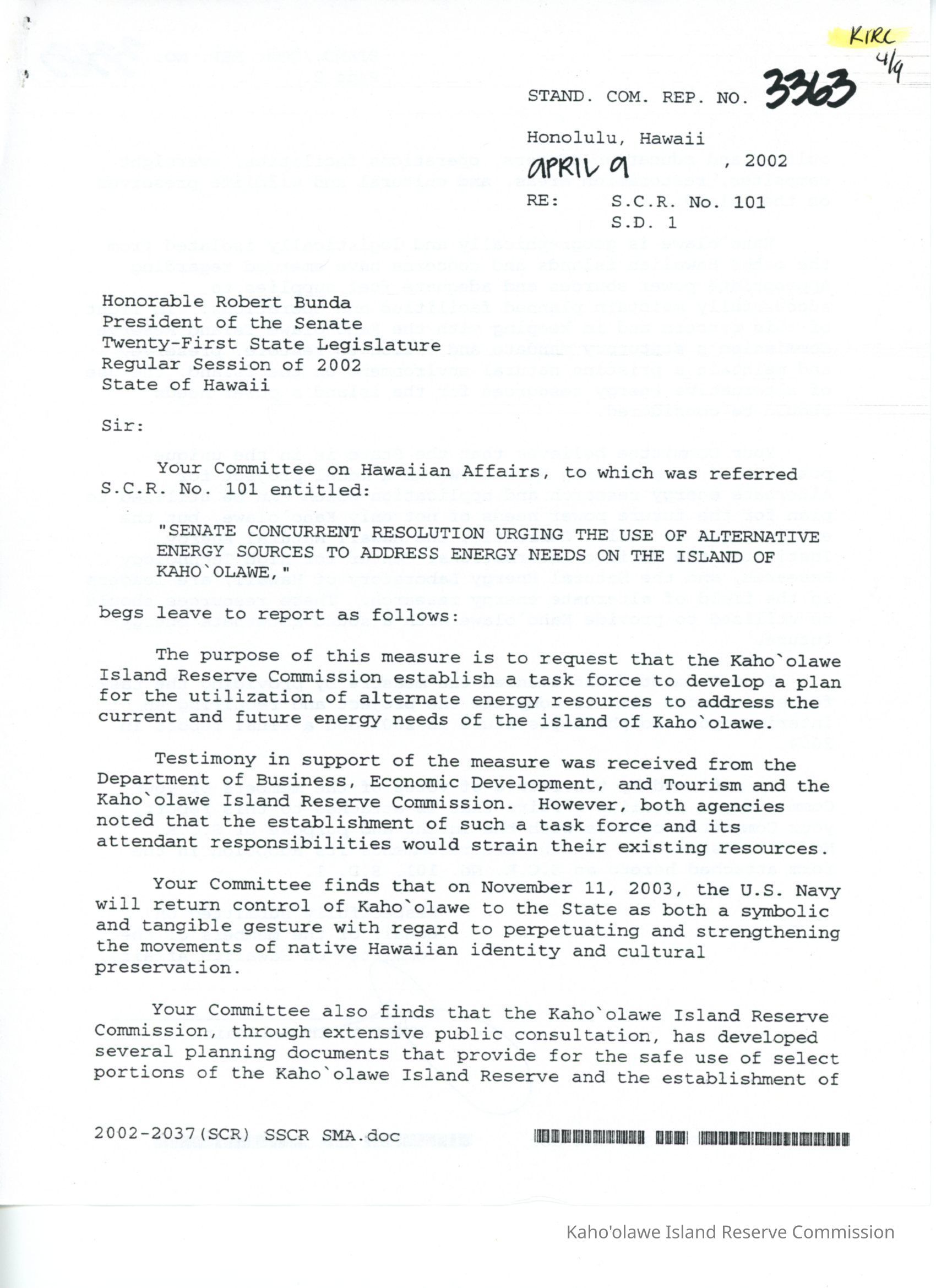 Copy of Standing Committee Report No. 3363 re: S.C.R. (Senate Concurrent Resolution) No. 101 S.D. (Senate Draft) 1 "Senate Concurrent Resolution Urging the Use of Alternative Energy Sources to Address Energy Needs on the Island of Kaho'olawe."Creator
