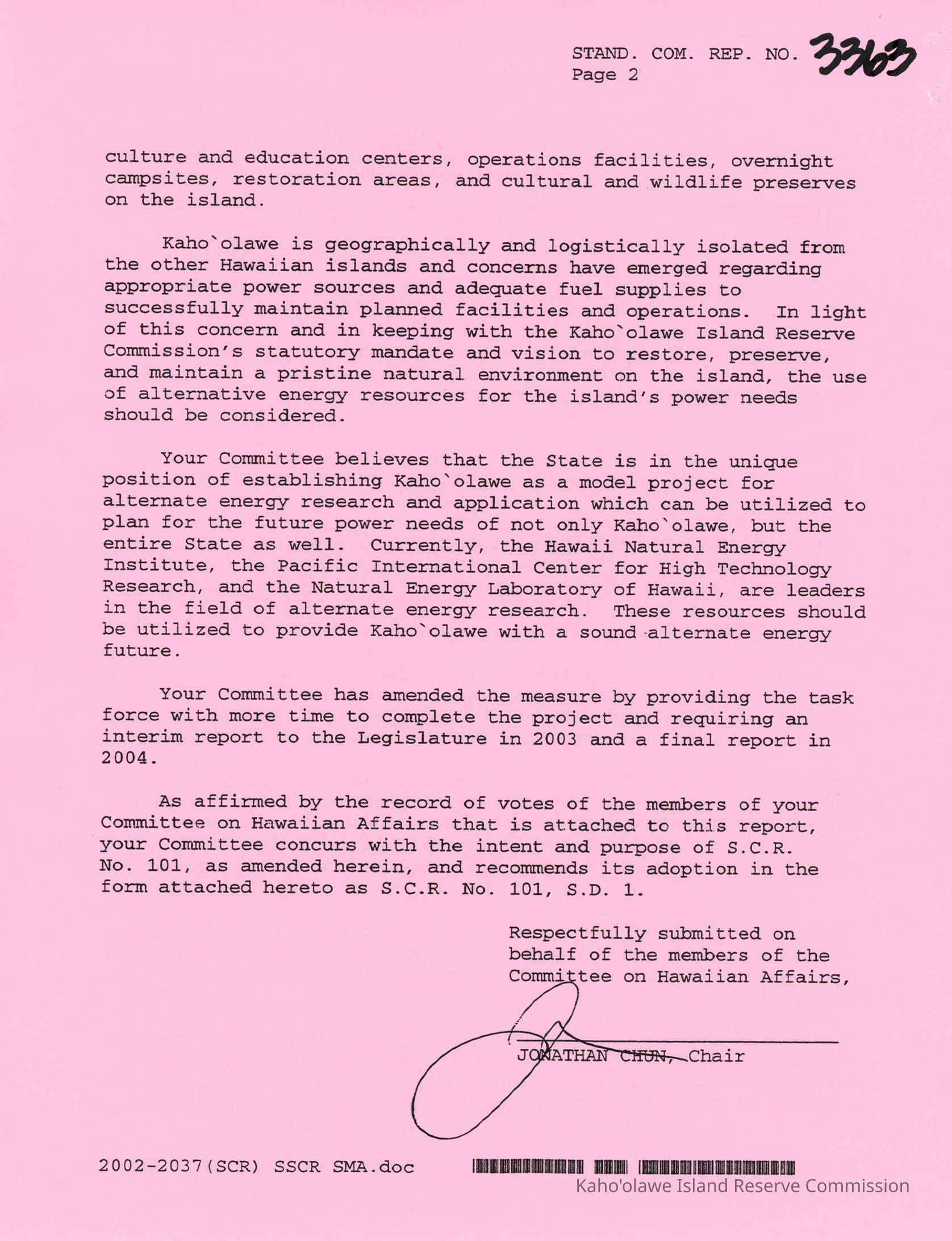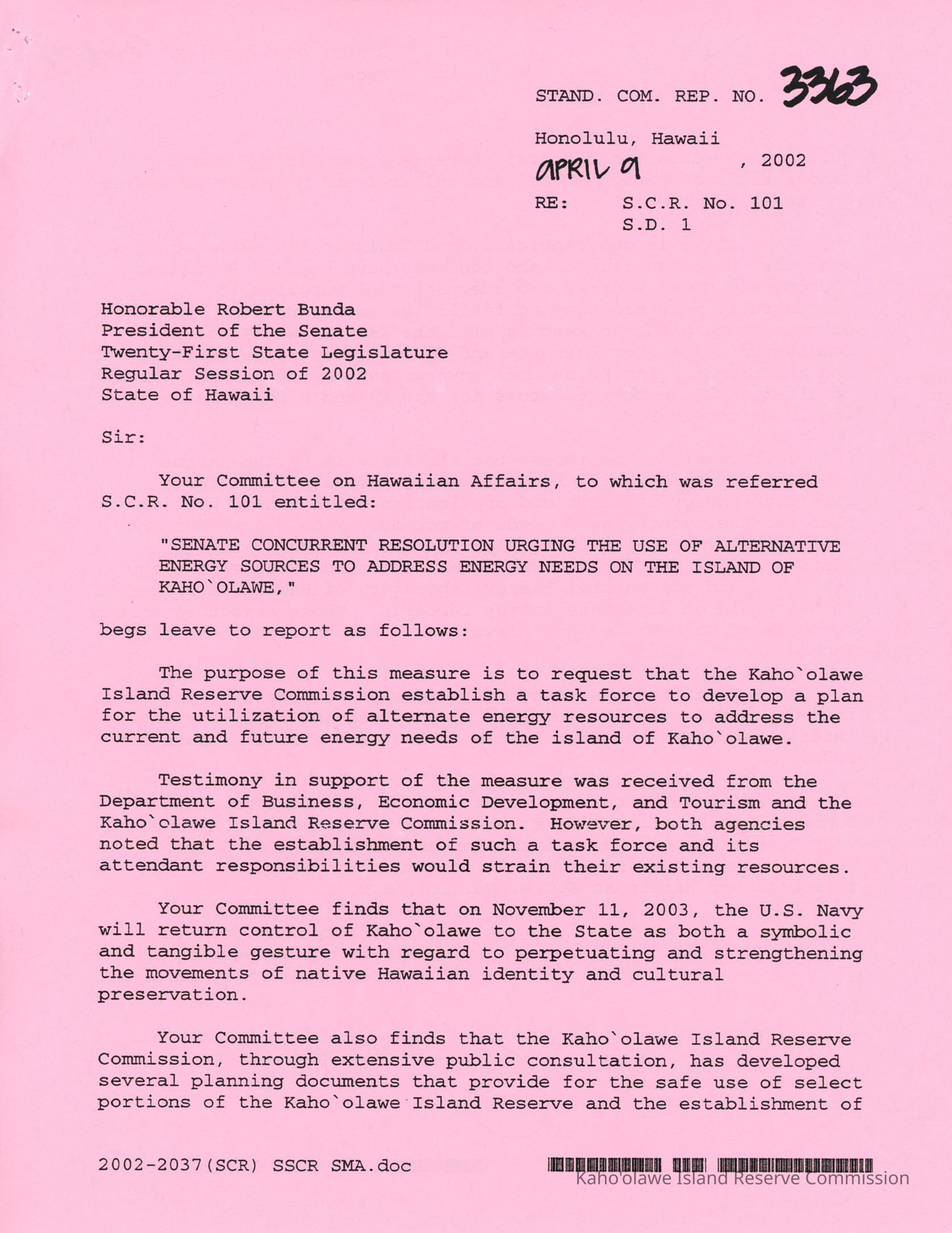 Copy of Standing Committee Report No. 3363 re: S.C.R. No. 101 S.D. 1, "Senate Concurrent Resolution urging the Use of Alternative Energy Sources to Address Energy Needs on the Island of Kaho'olawe."Creator