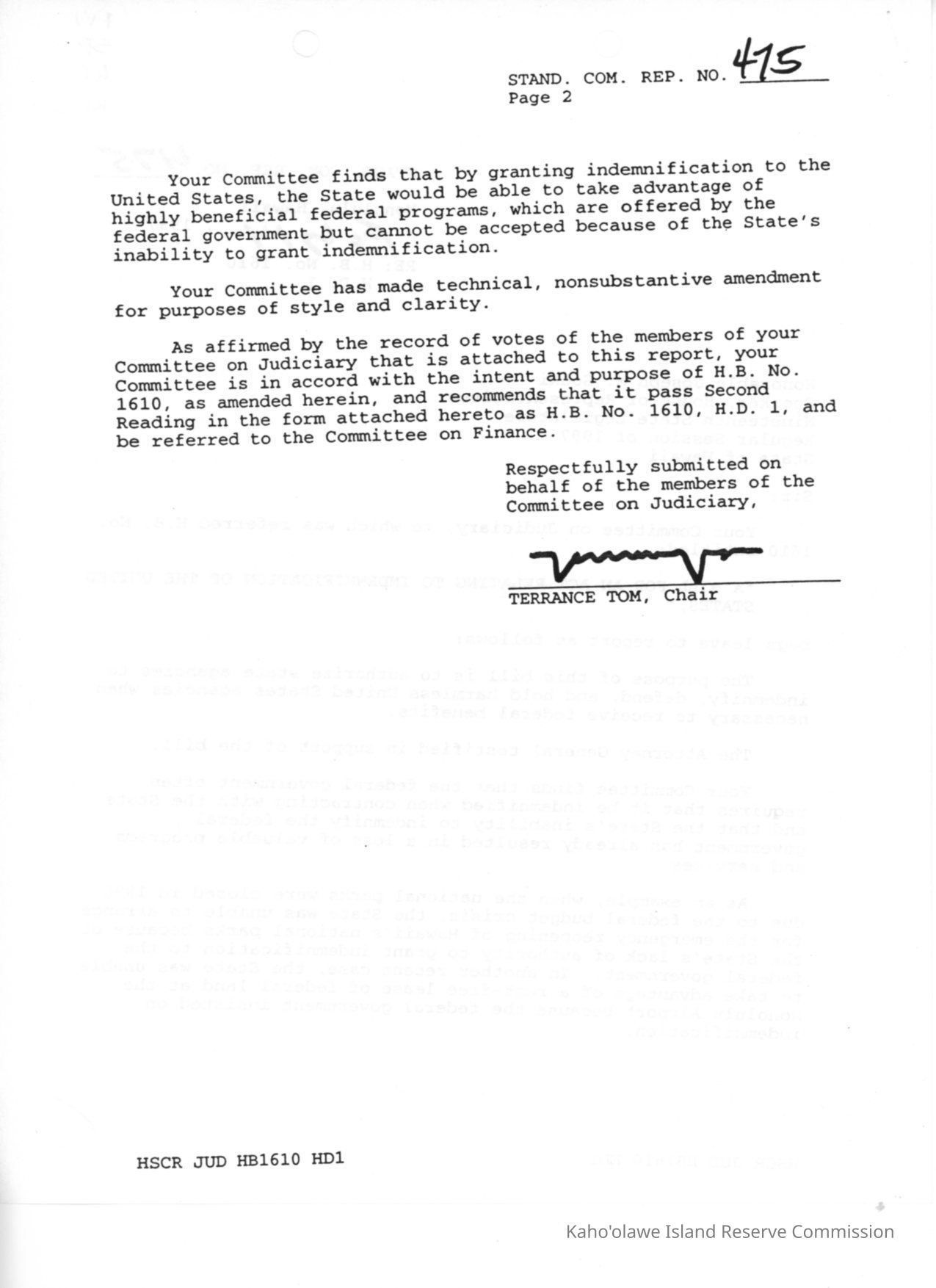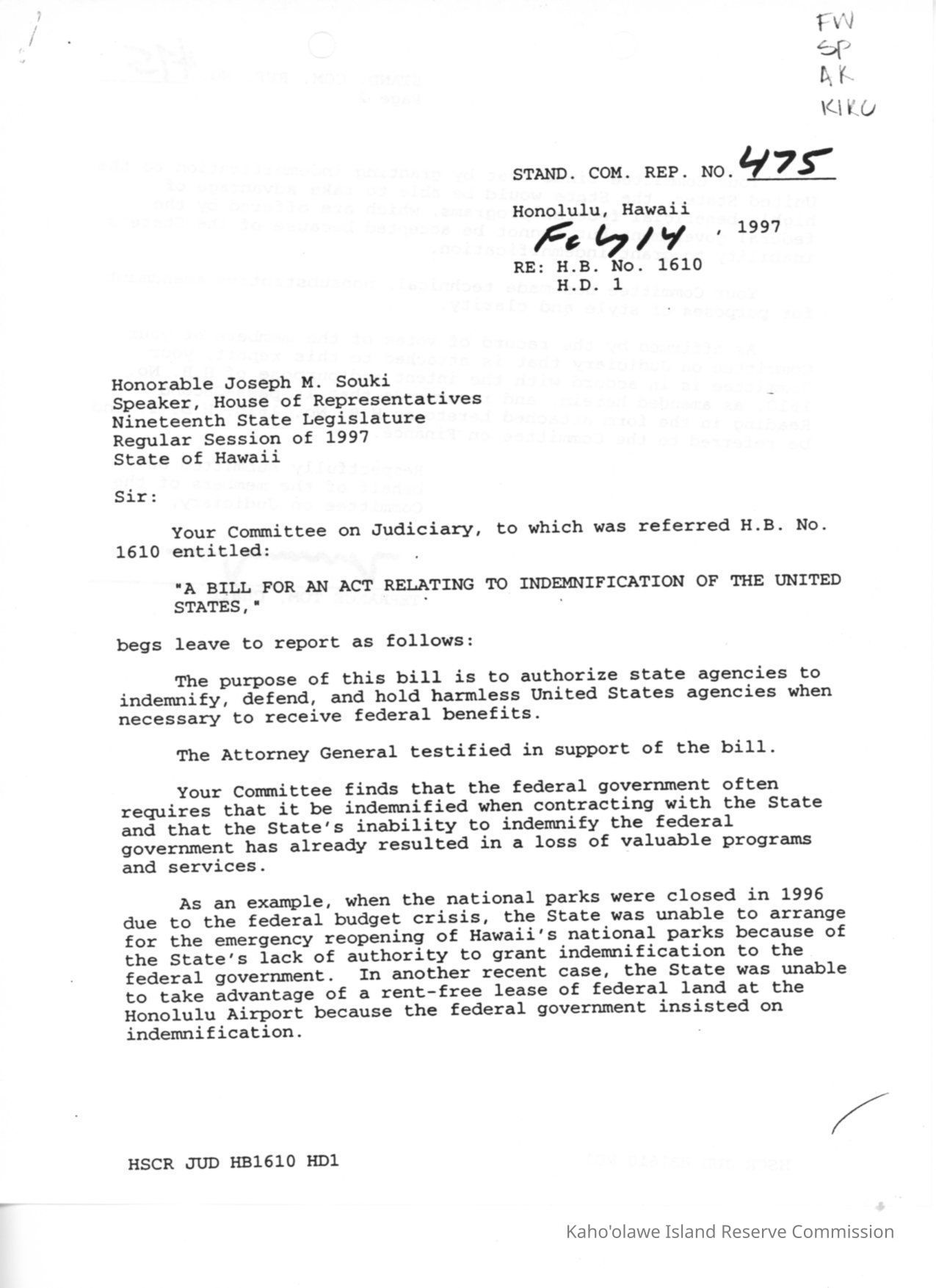 Standing Committee Report No. 475 re: H.B. (House Bill) No. 1610, H.D. 1, A Bill for an Act Relating to Indemnification of the United States.Creator