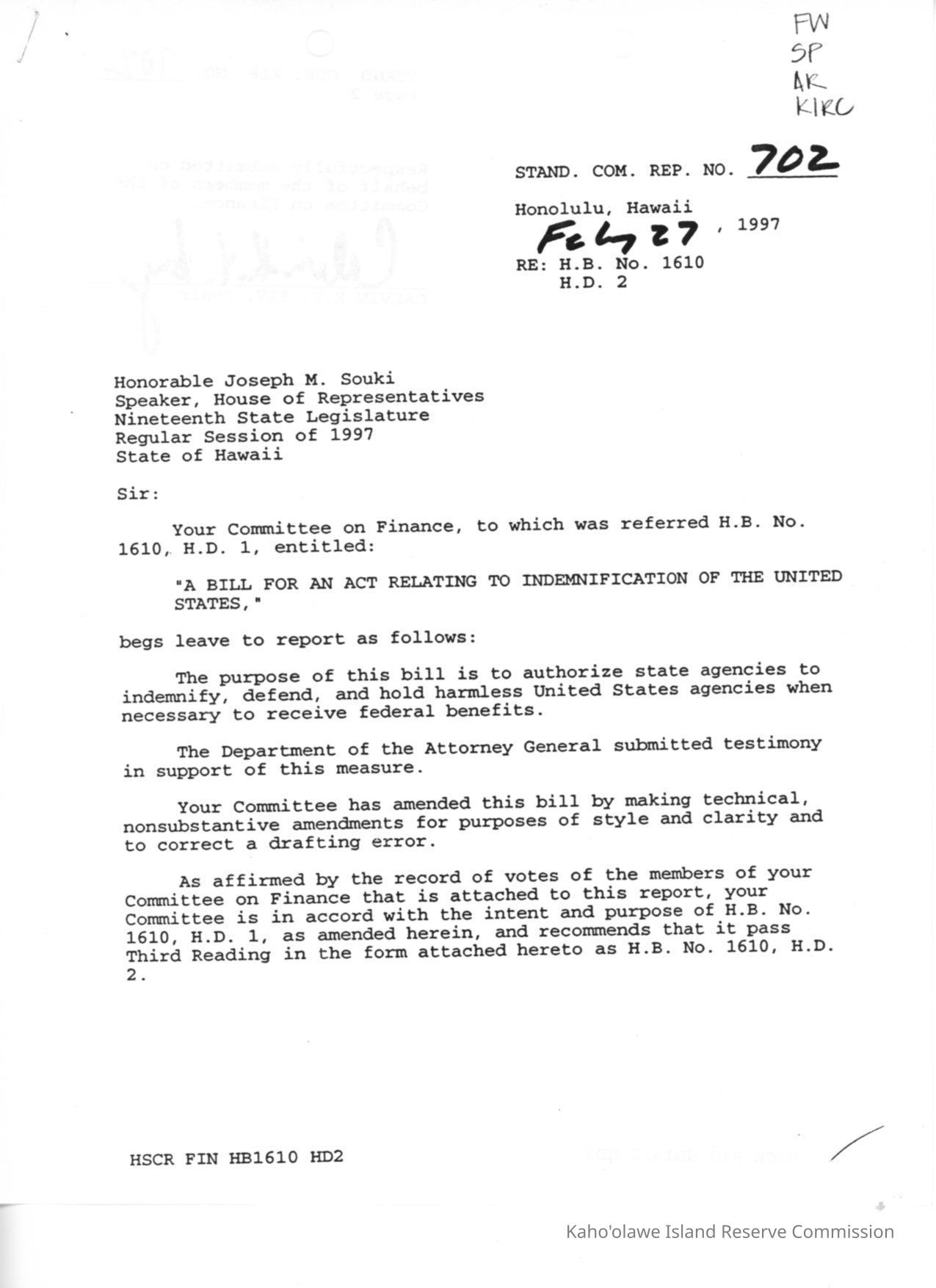 Standing Committee Report No. 702 re: H.B. (House Bill) No. 1747, A Bill for an Act Relating to Indemnification of the United States."Creator