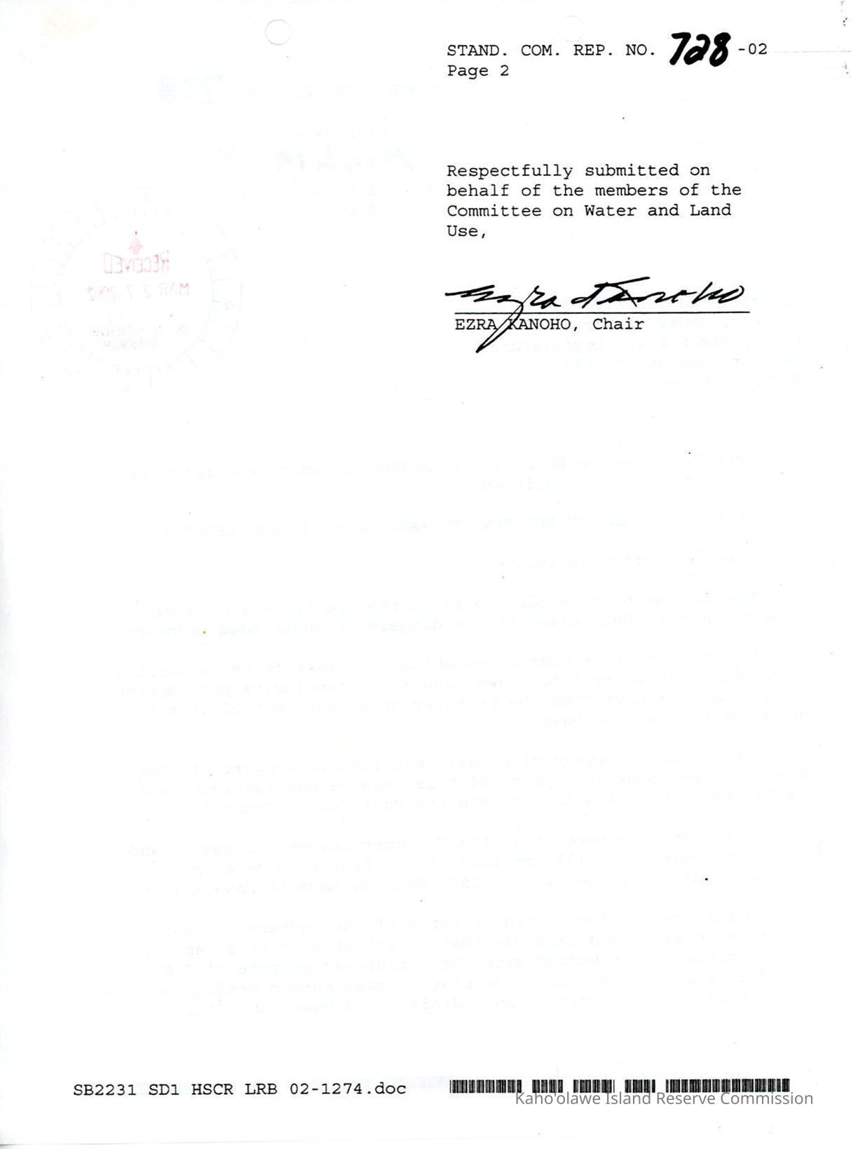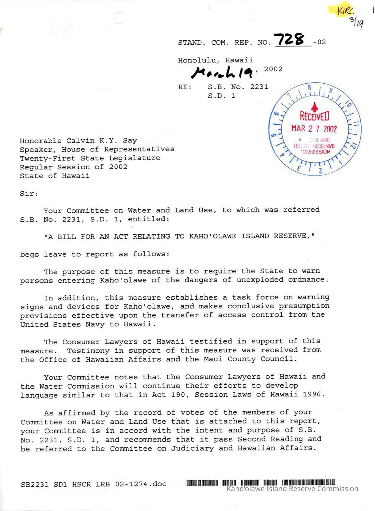 Copy of Standing Committee Report No. 728-02 re: S.B. No. 2231, S.D. 1, "A Bill for An Act Relating to Kaho'olawe Island Reserve."Creator