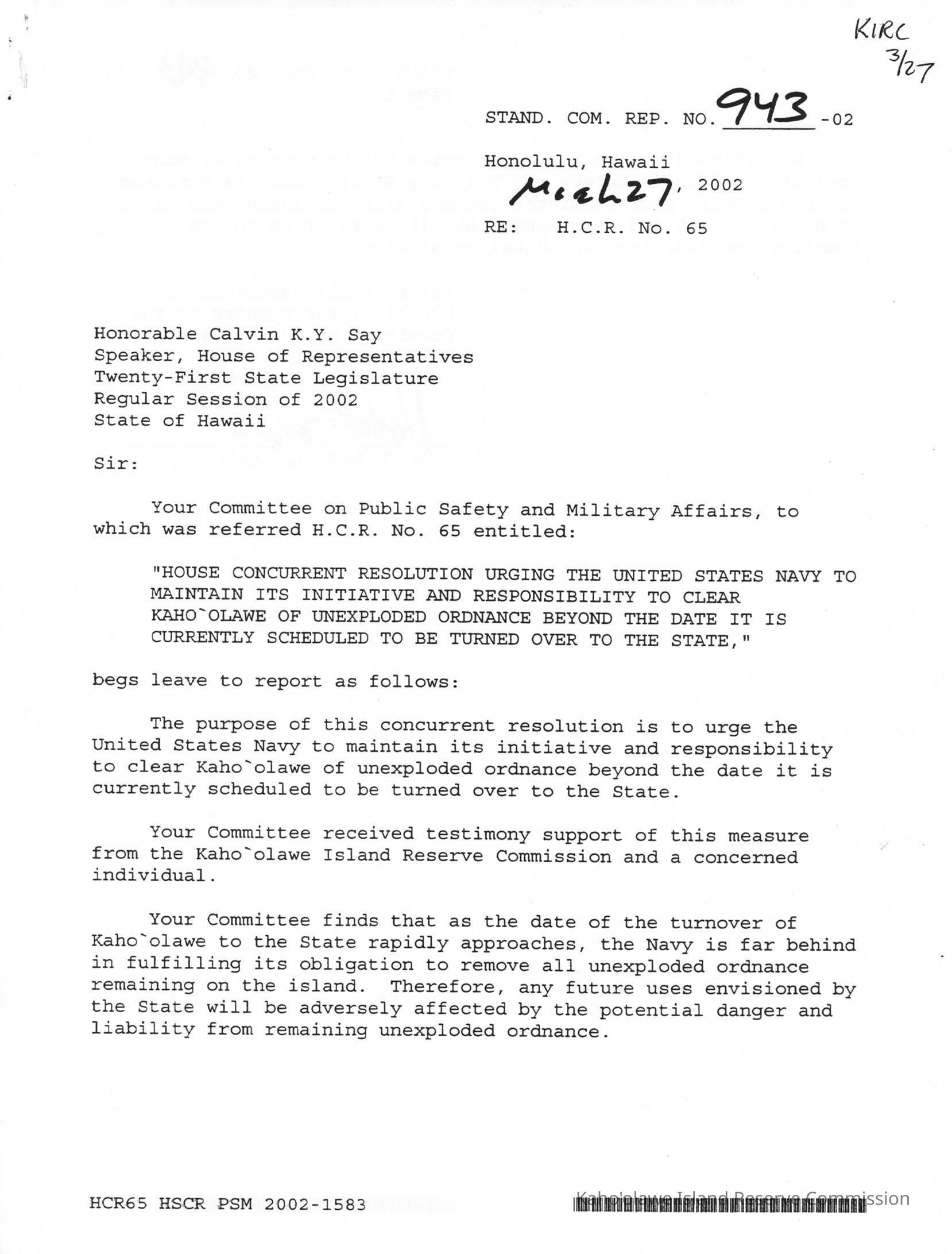 Copy of Standing Committee Report No. 943-02 re: "House Concurrent Resolution Urging the United States Navy to Maintain Its Initiative and Responsibility to Clear Kaho'olawe of Unexploded Ordnance Beyond the Date It Is Currently Scheduled to Be Turned to the State."Creator