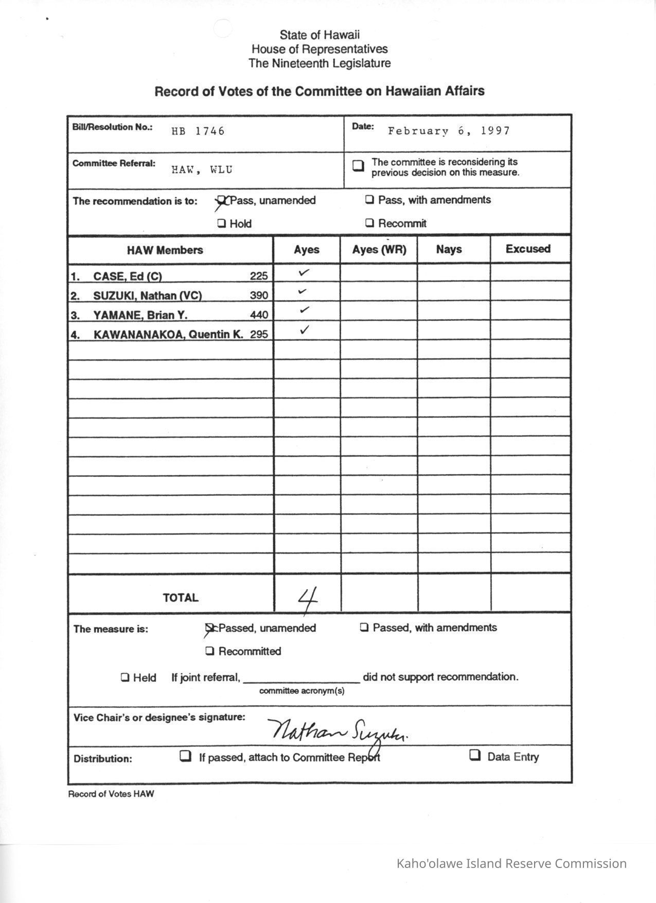 State of Hawaii, House of Representatives, The Nineteenth Legislature, Record of Votes of the Committee on Hawaiian Affairs for HB 1746.Creator