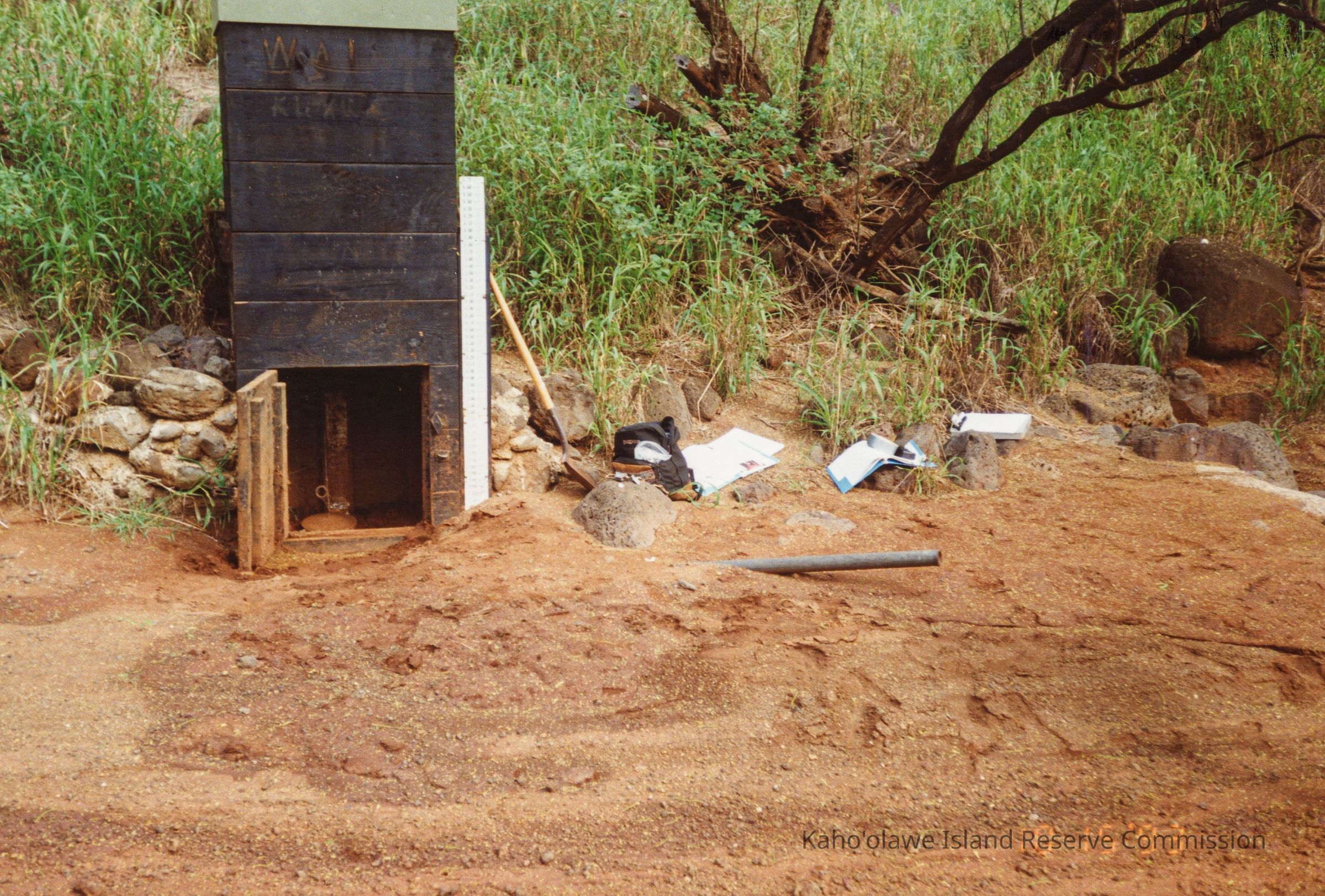 Color photograph of a wooden stream gage next to what is probably a dry streambed. A backpack and various papers are on rocks next to it. It was probably taken in Hakioawa. The number 5 and 10/15/93 handwritten in black in on the back.