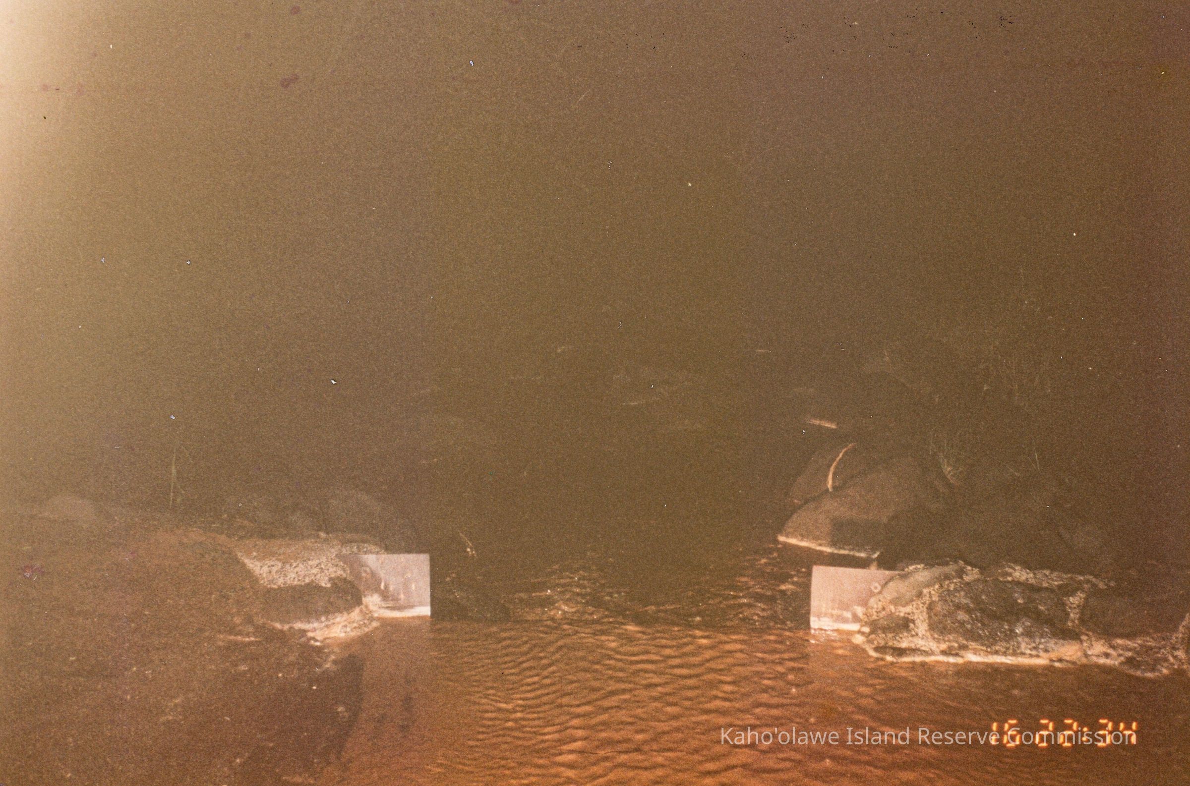 The image shows a dimly lit scene with murky water flowing between large rocks