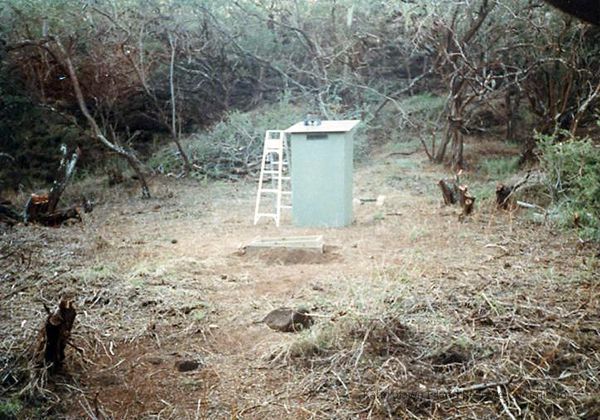 Color photo of a structure in the middle of a clearing surrounded by trees in an unidentified area.
