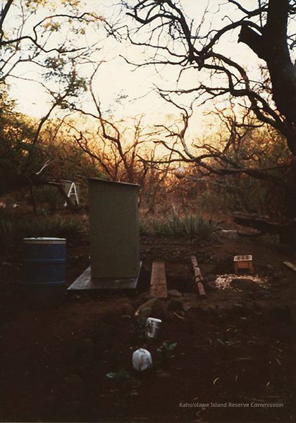 Color photo of a structure (possible outhouse) surrounded by trees.