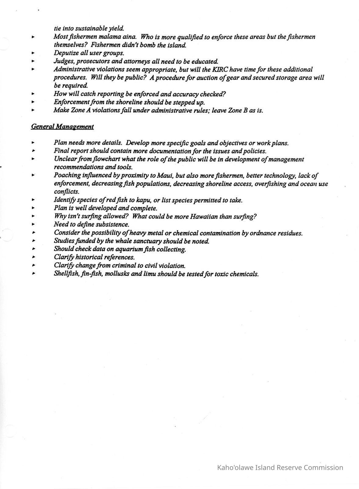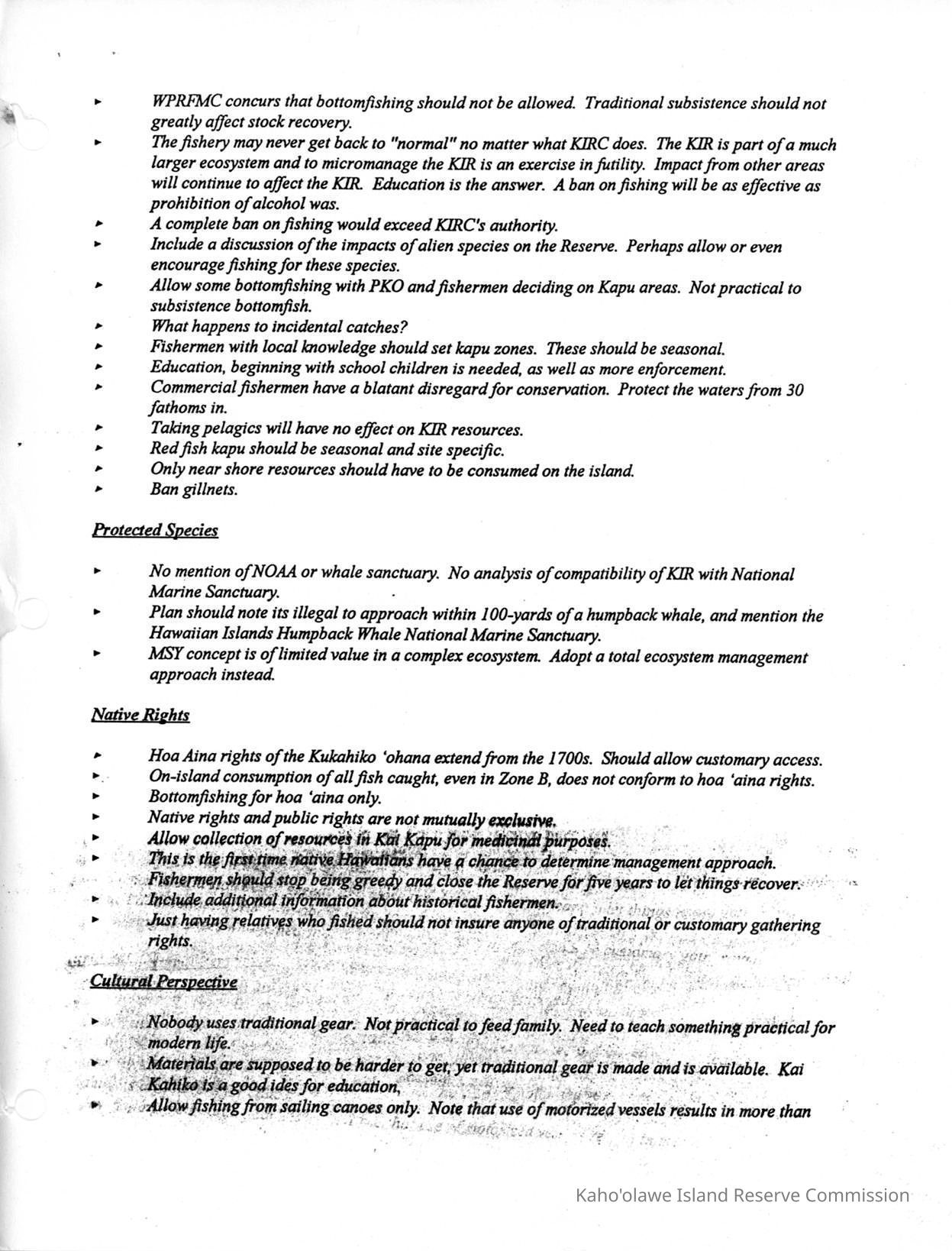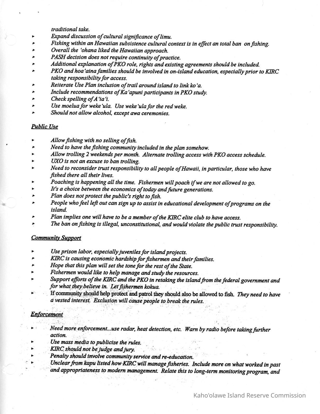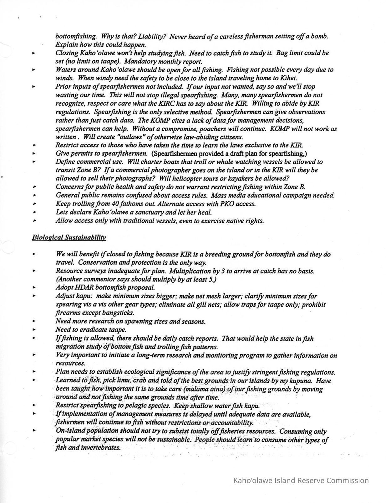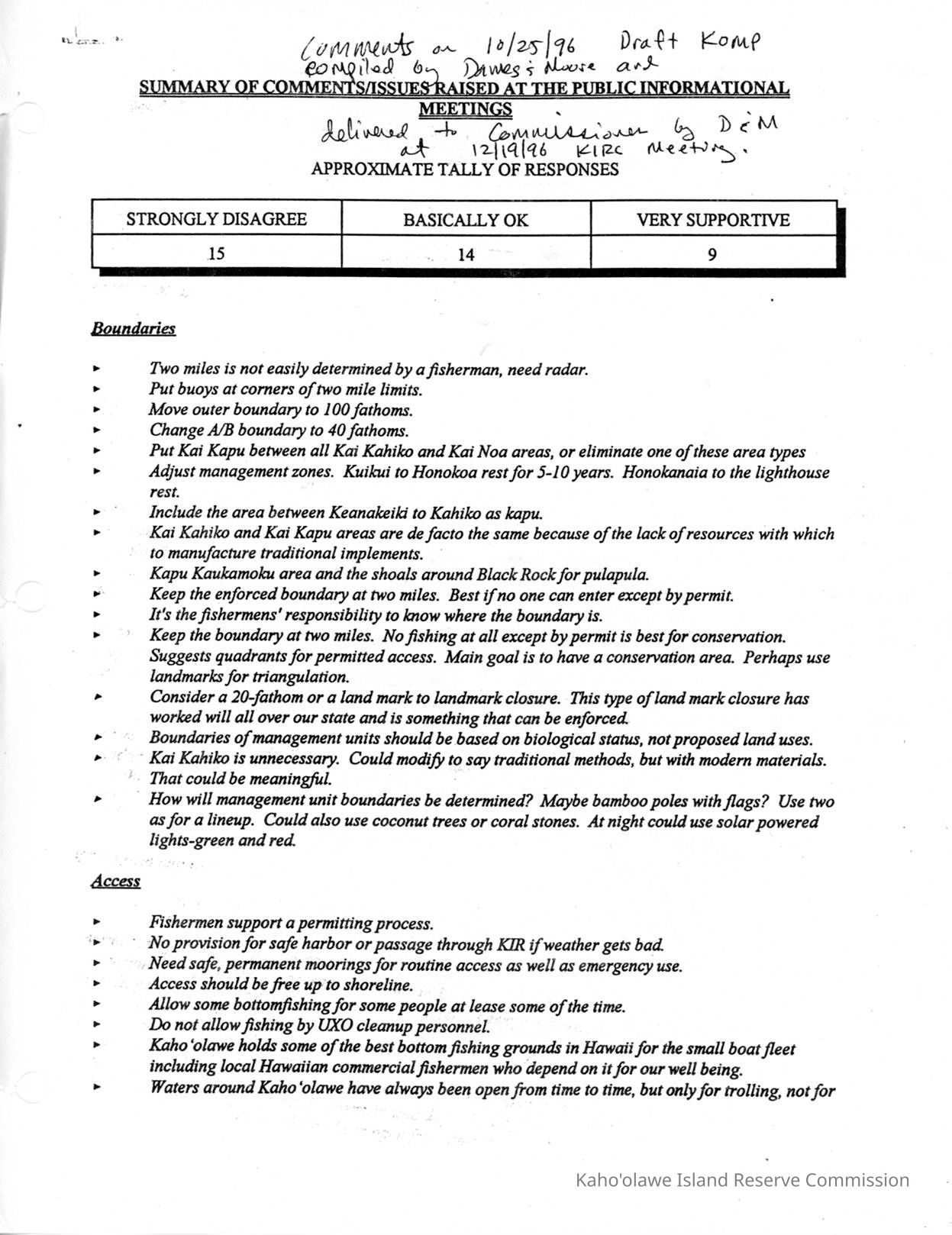 Contains approximate tally of responses and comments under the headings of: boundaries, access, biological sustainability, protected species, native rights, cultural perspective, public use, community support, enforcement and general management.Collection