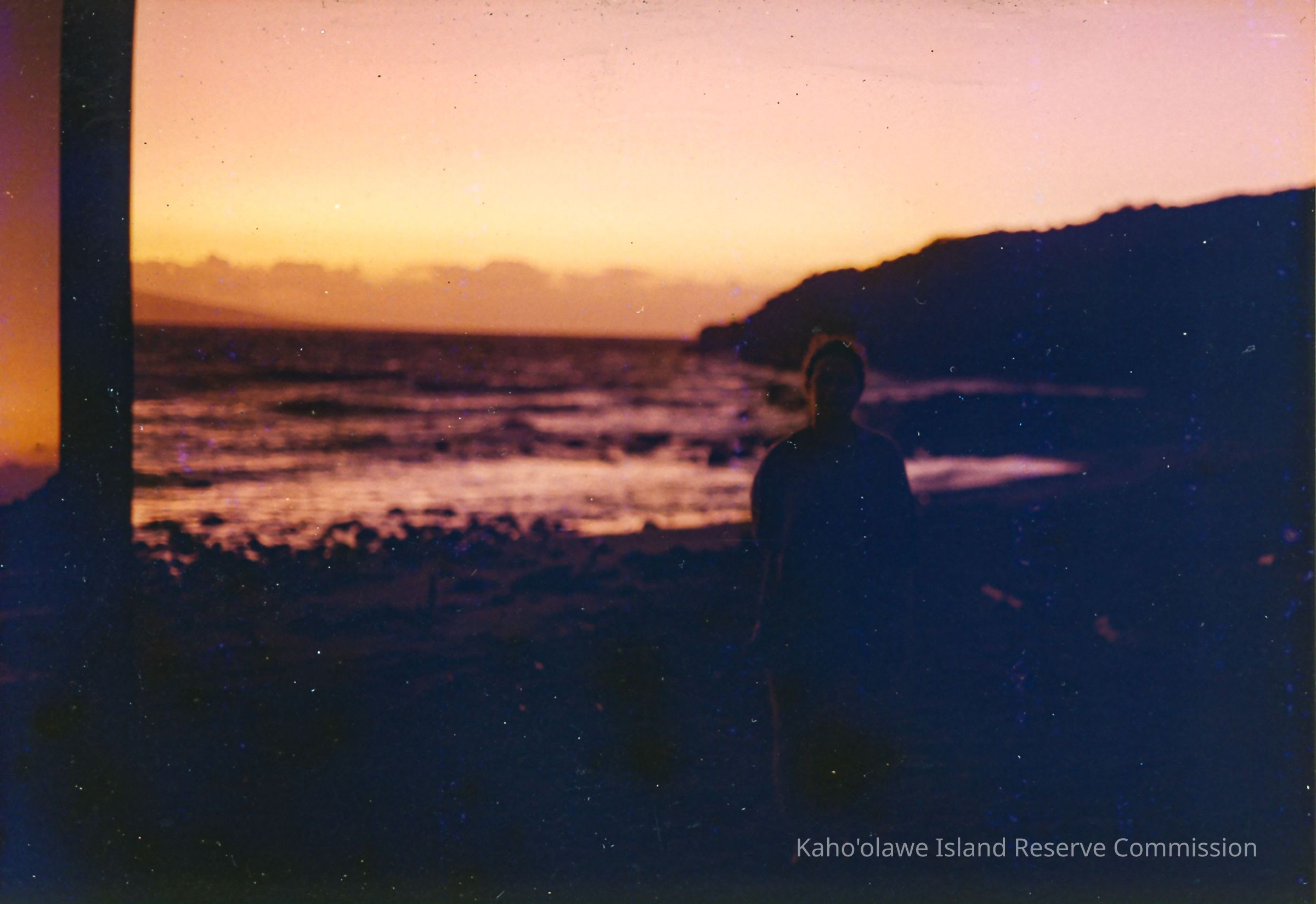 Color photo of an unidentified person standing on Kaho'olawe coastline at sunrise.