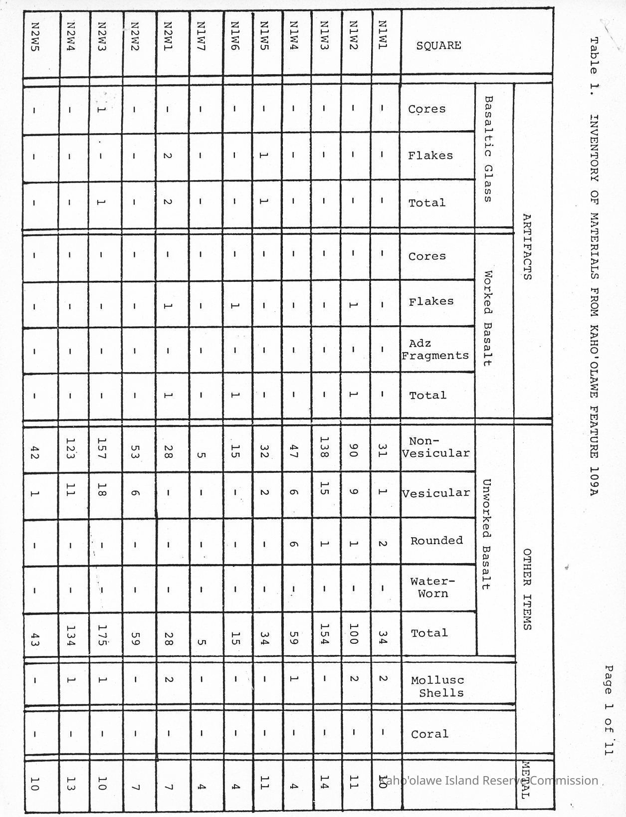Table 1-Inventory of Materials from Kaho'olawe Feature 109A listing artifacts and other items. 11 repographic black and white copied pagesCreator