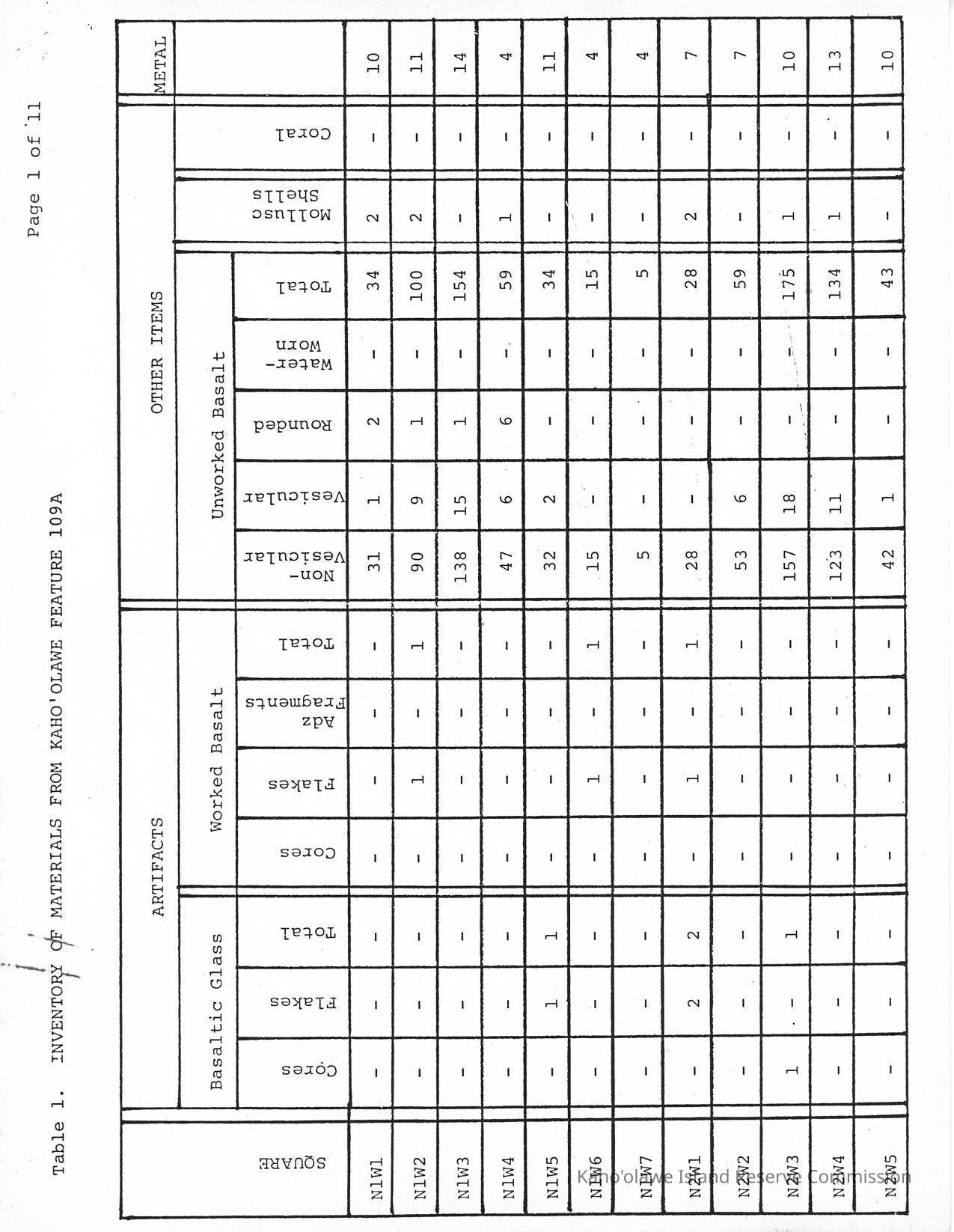 Table 1: Inventory of Materials from Kaho'olawe Feature 109A of artifacts of basaltic glass and other items. 11 repographic black and white copied pages and 2 sheets of 10" x 16.5" graph paperDate(s) of Creation