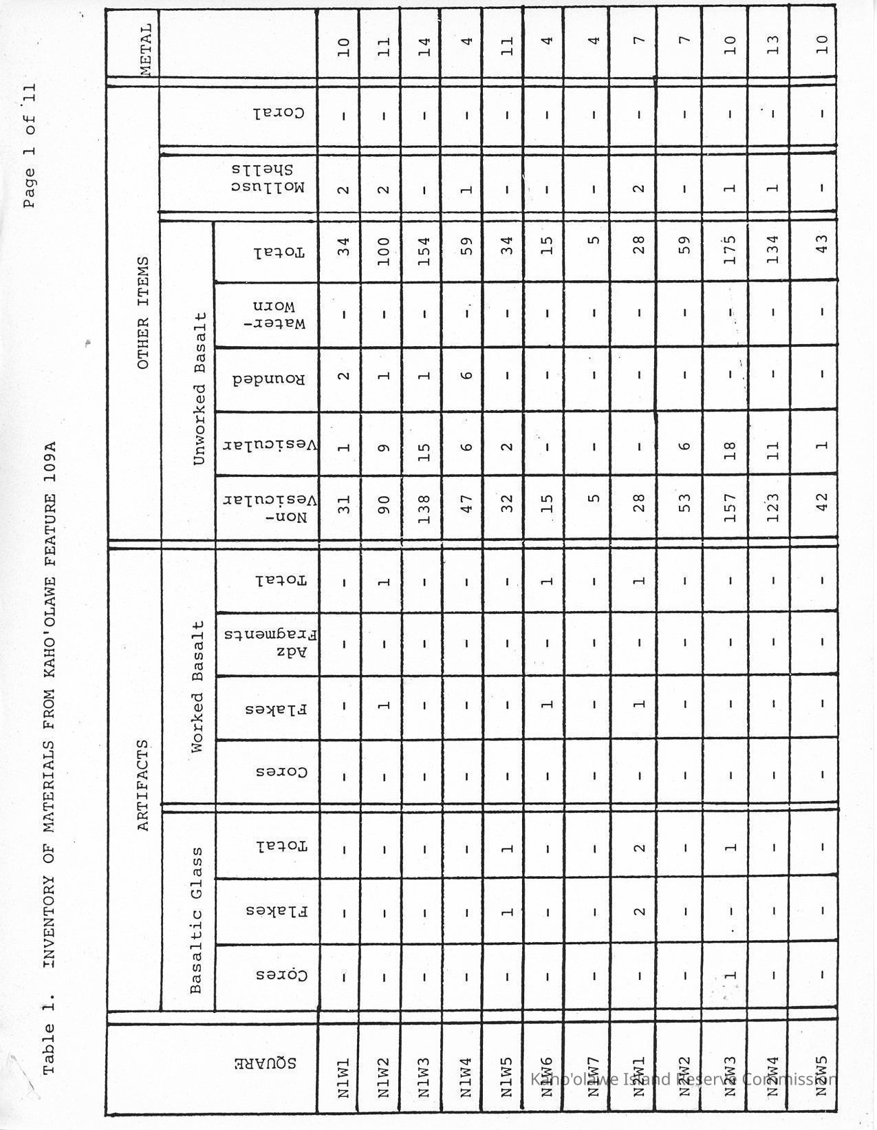 Table 1-Inventory of materials from Kaho'olawe Feature 109ADescription