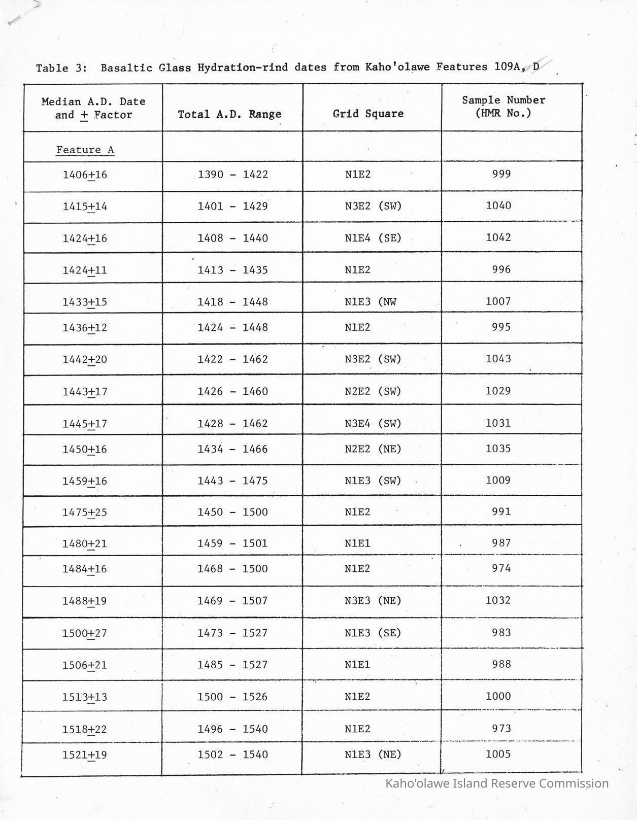 Reprographically copied pages of Table 3-Basaltic Glass Hydration-rind dates from Kaho'olawe Features 109A, D. Three reprographically copied black and white pages.Creator