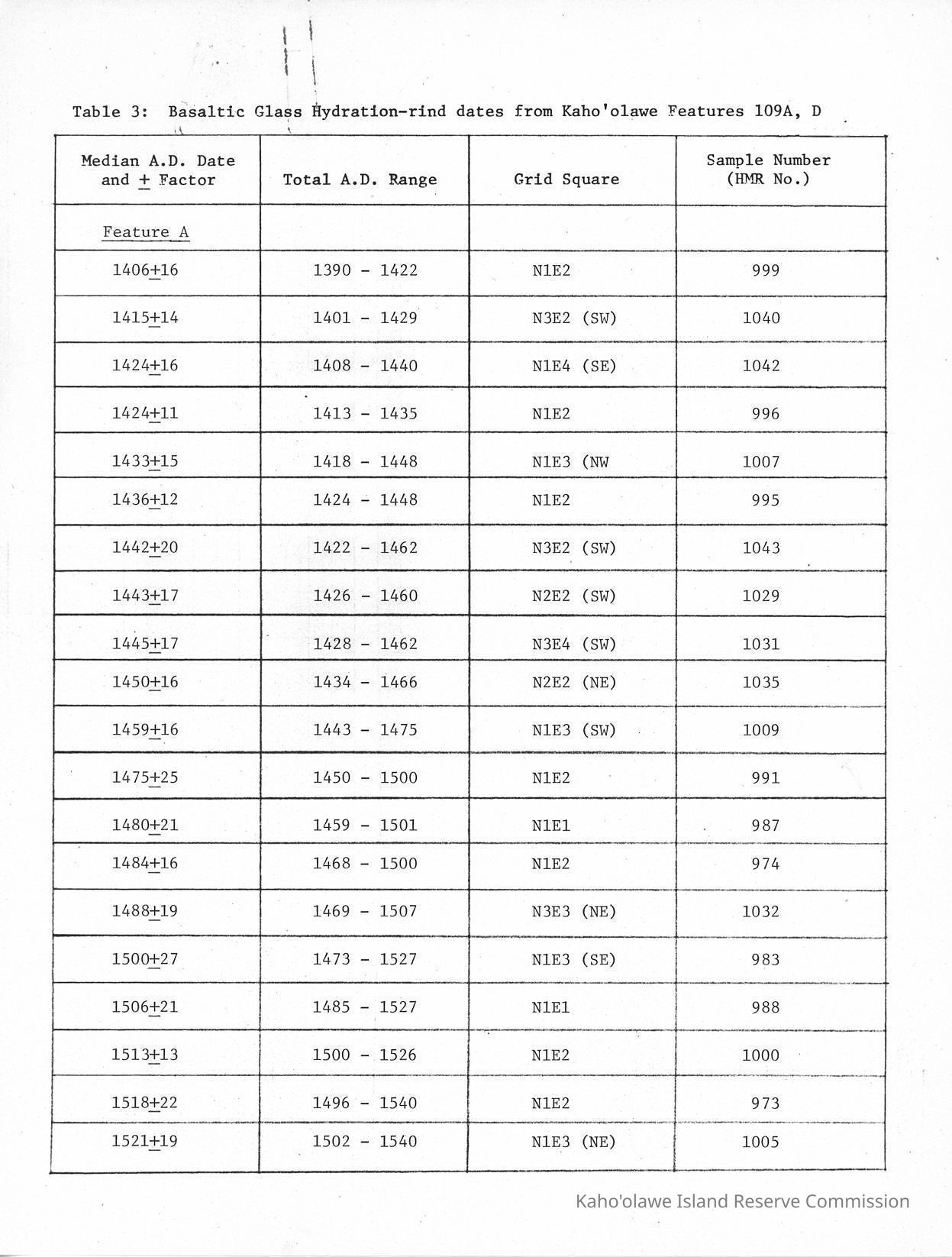 Table 3: Basaltic Glass Hydration-rind dates from Kaho'olawe Features 109A, D which lists the median A.D. date and +/- factor, total A.D. range, grid square and sample number (HMR No.). Four completed forms with information typed in.Date(s) of Creation