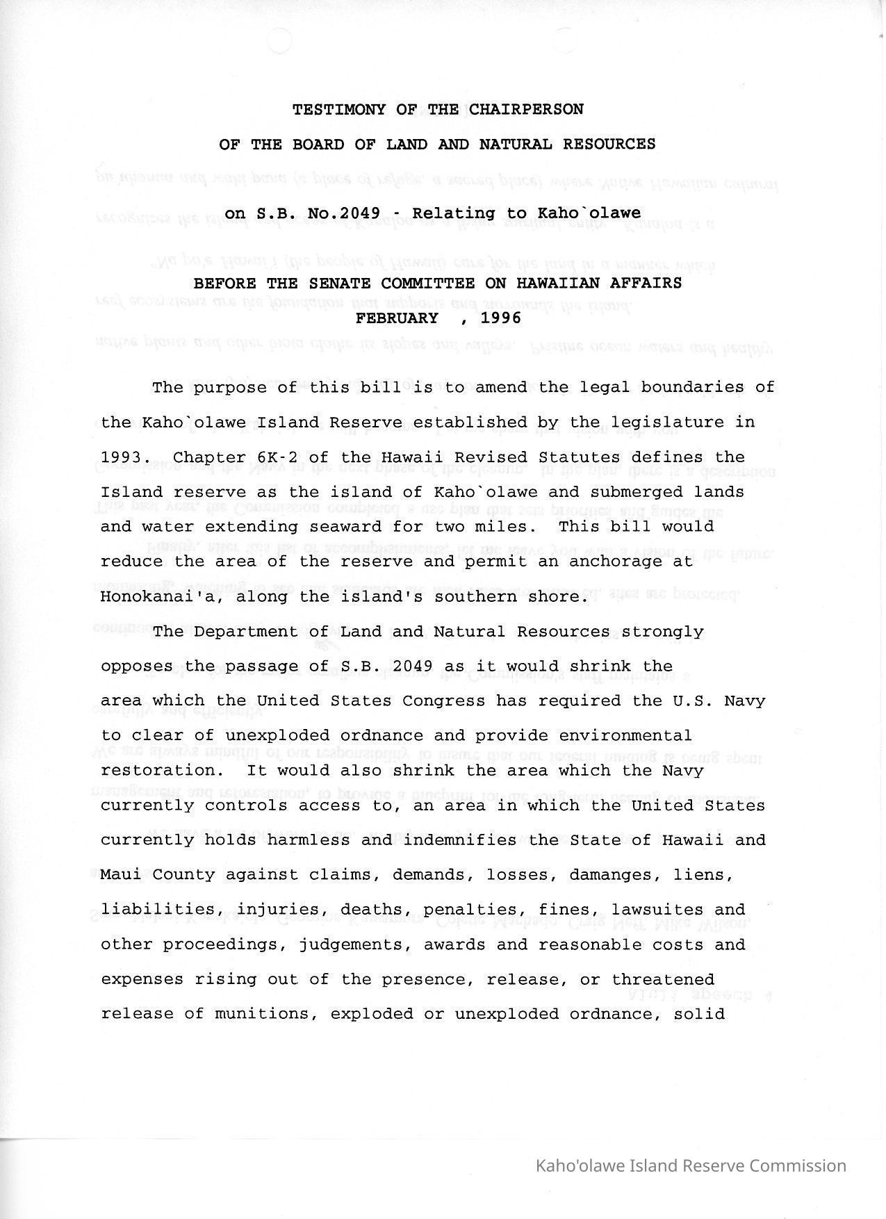 Testimony of the Chairperson of the Board of Land and Natural Resources on S.B. No. 2049-Relating to Kaho'olawe; Before the Senate Committee on Hawaiian Affairs, February 1996.Creator