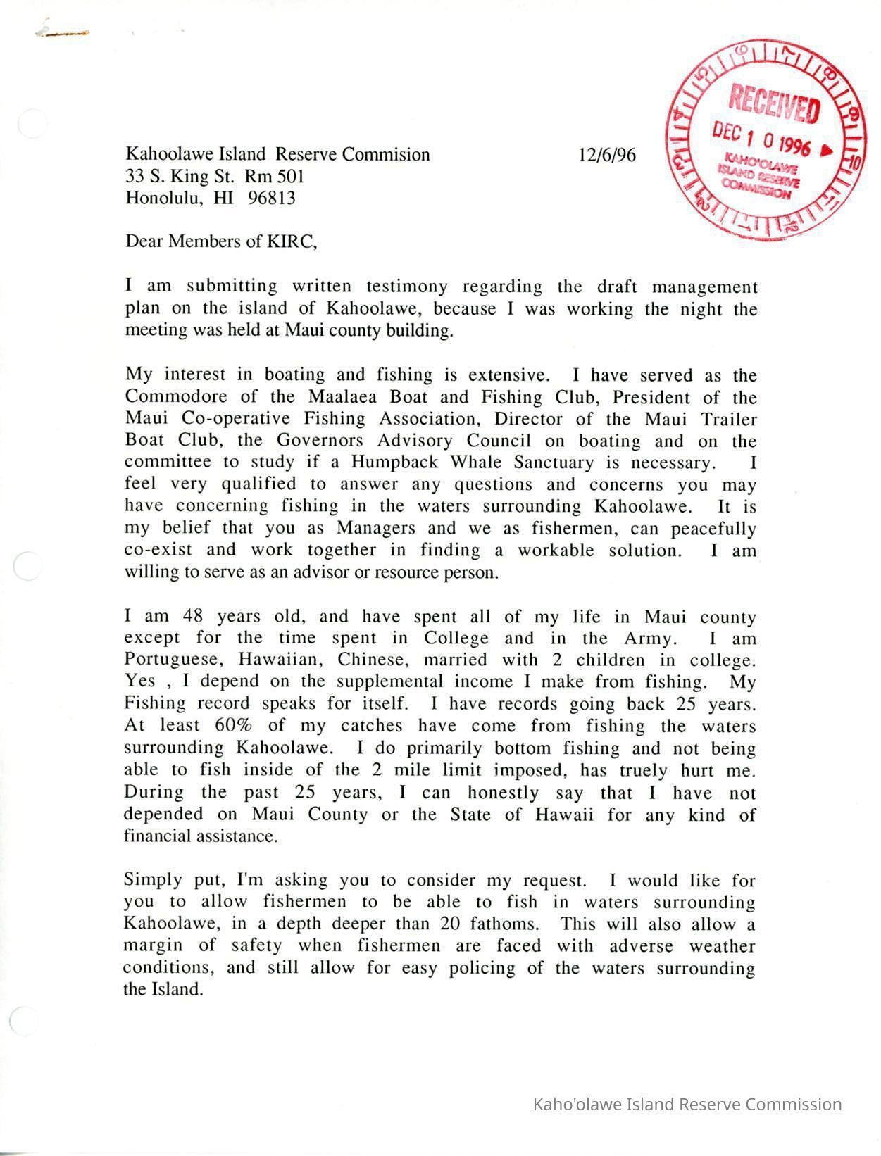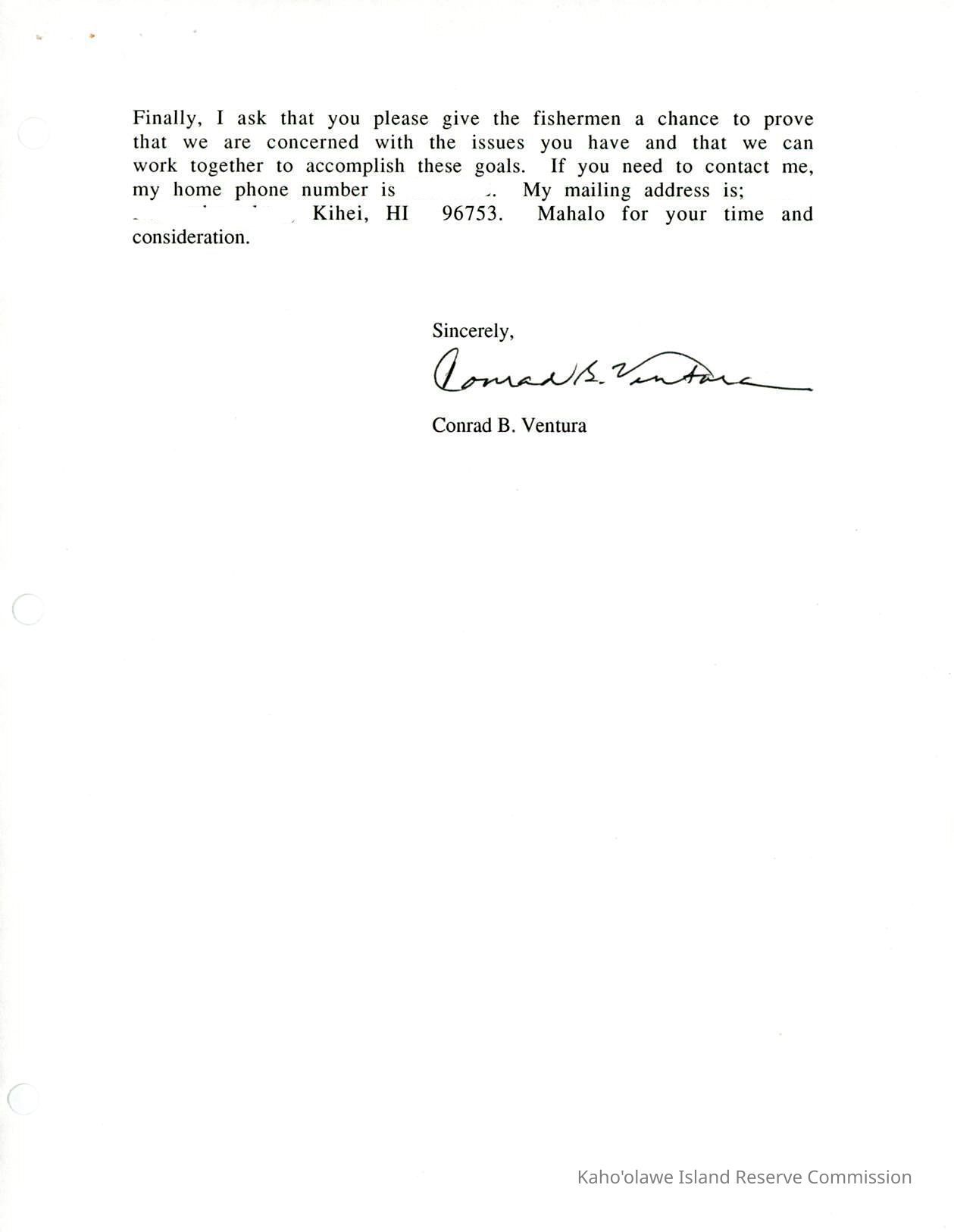 Written testimony the KIRC regarding the draft management plan for Kahoolawe from Conrad Ventura.Creator