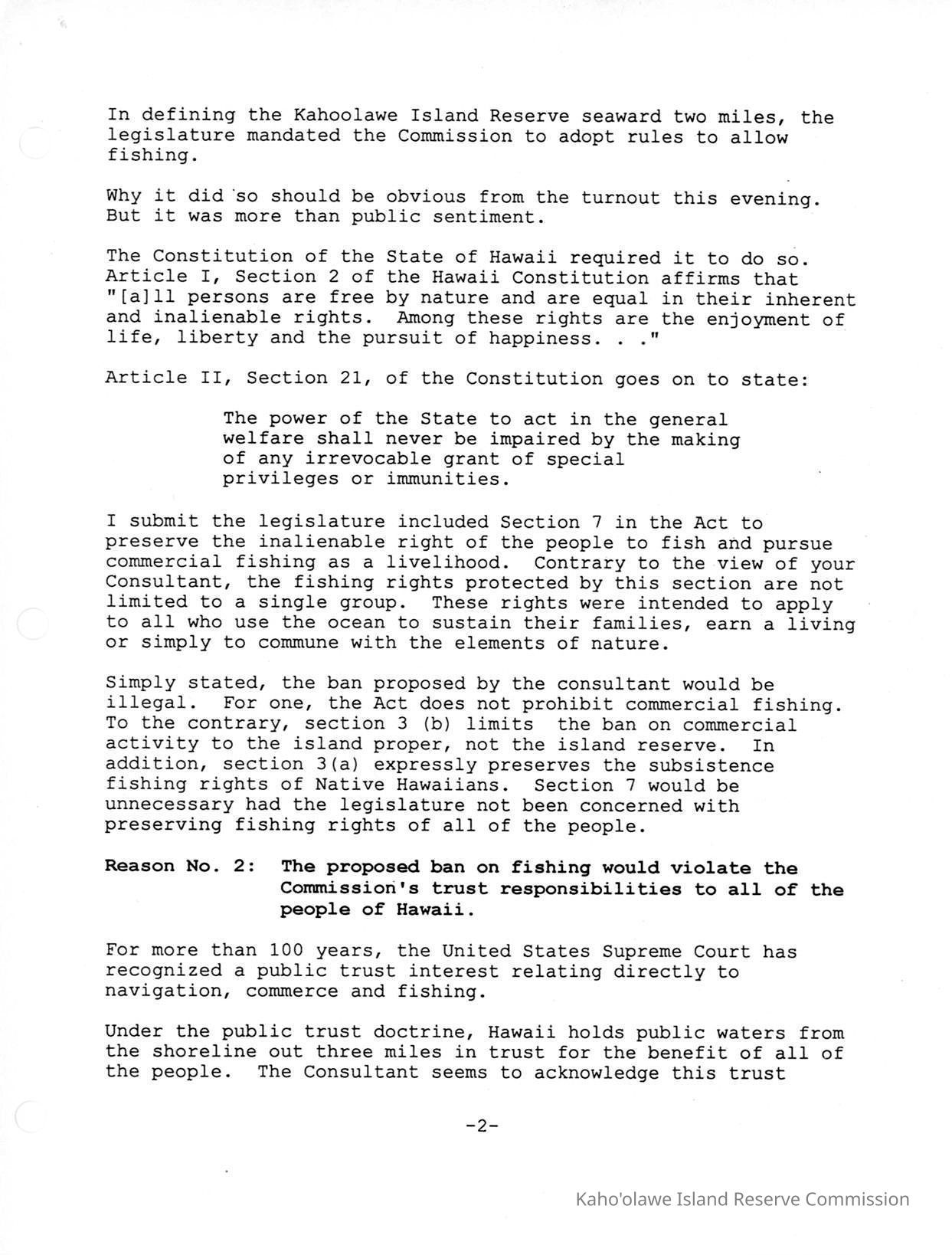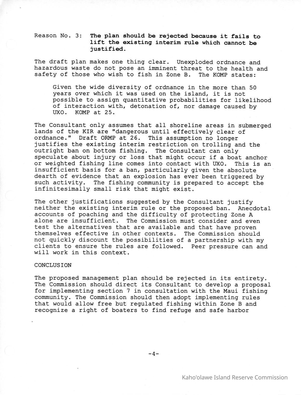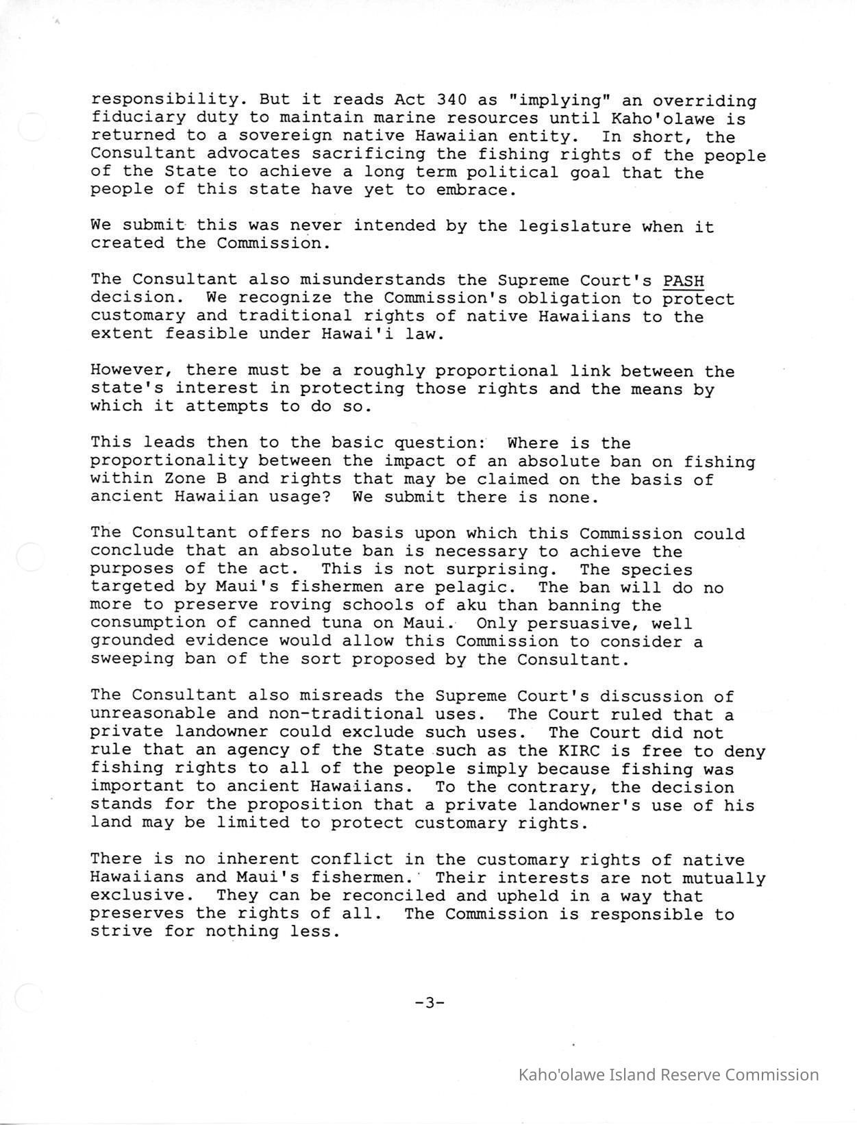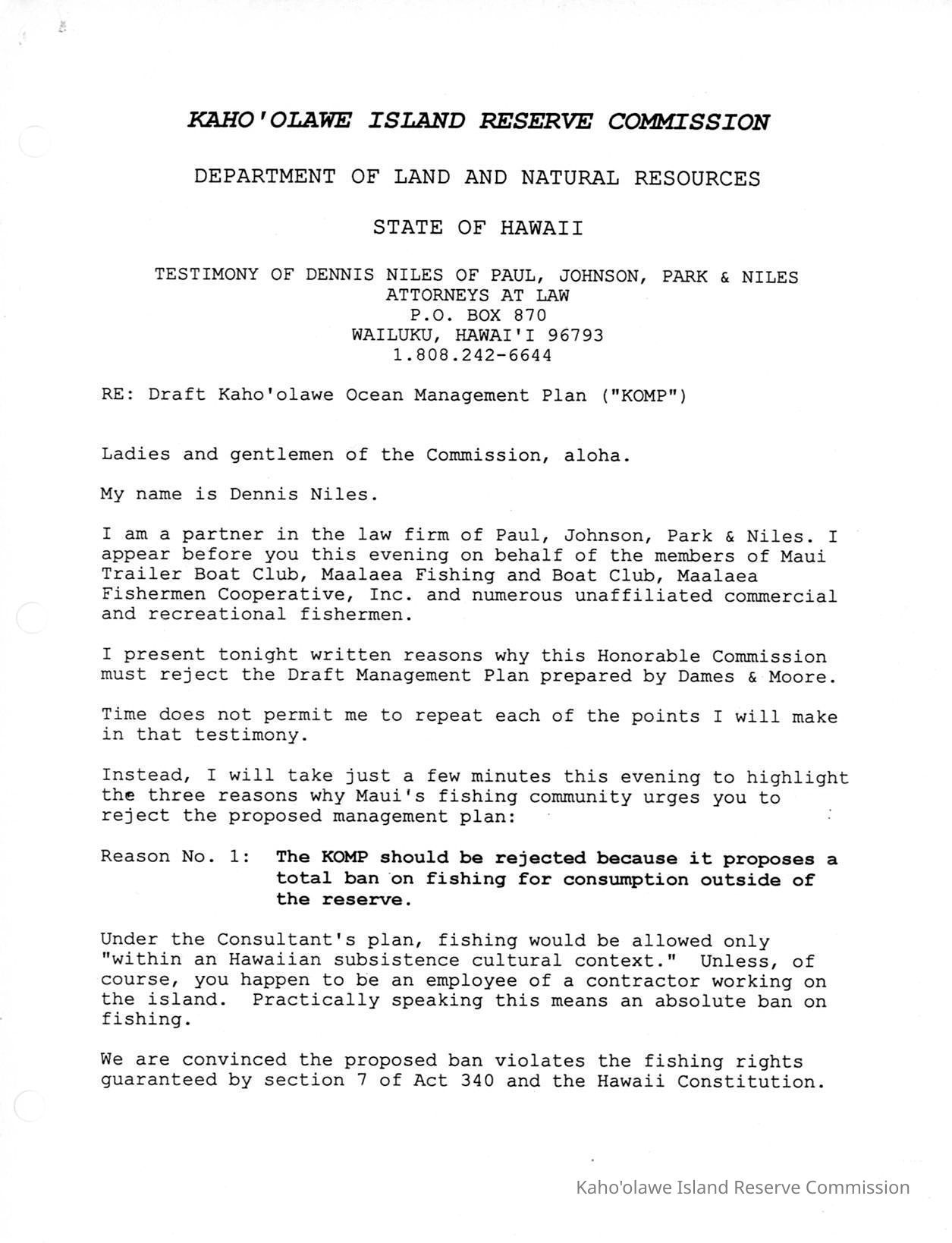 Copy of Kaho'olawe Island Reserve Commission, Department of Land and Natural Resources, State of Hawaii, Testimony of Dennis Niles of Paul, Johnson, Park & Niles, Attorneys at Law re: Draft Kaho'olawe Ocean Management Plan ("KOMP").Creator