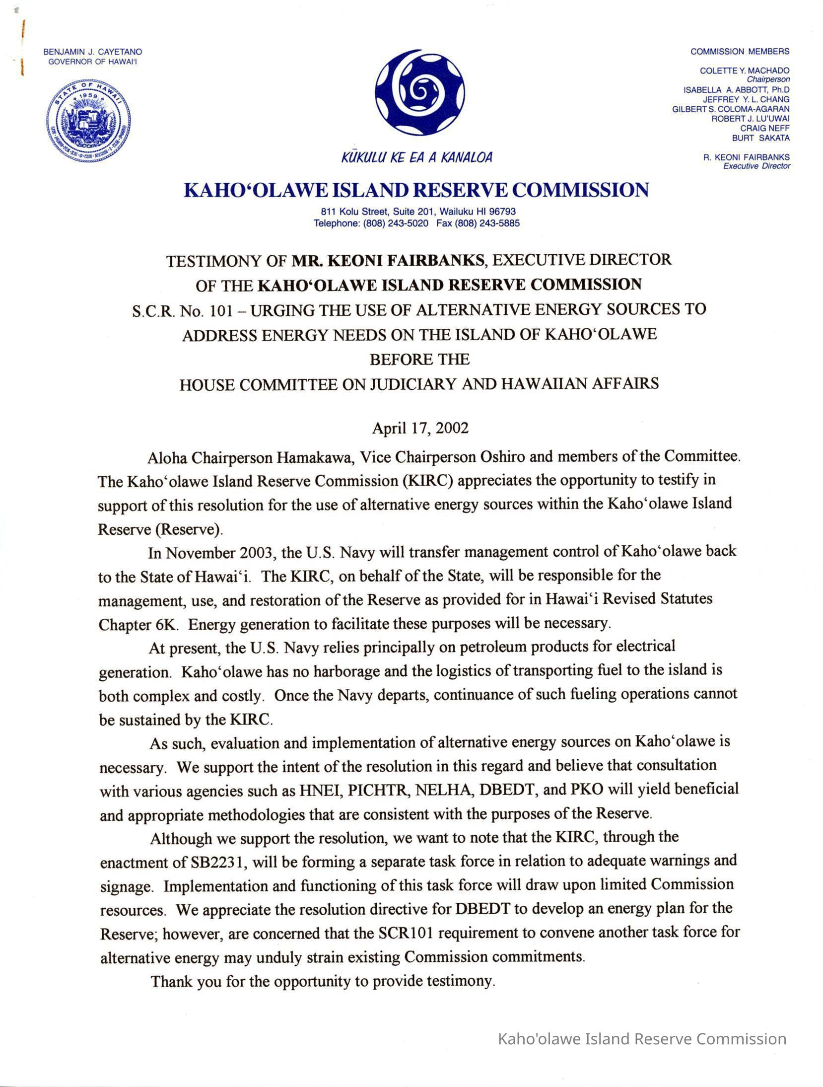 Testimony of Mr. Keoni Fairbanks, Executive Director of the Kaho'olawe Island Reserve Commission, S.C.R. No. 101-Urging the Use of Alternative Energy Sources to Address Energy Needs on the Island of Kaho'olawe Before the House Committee on Judiciary and Hawaiian Affairs, April 17, 2002.Creator