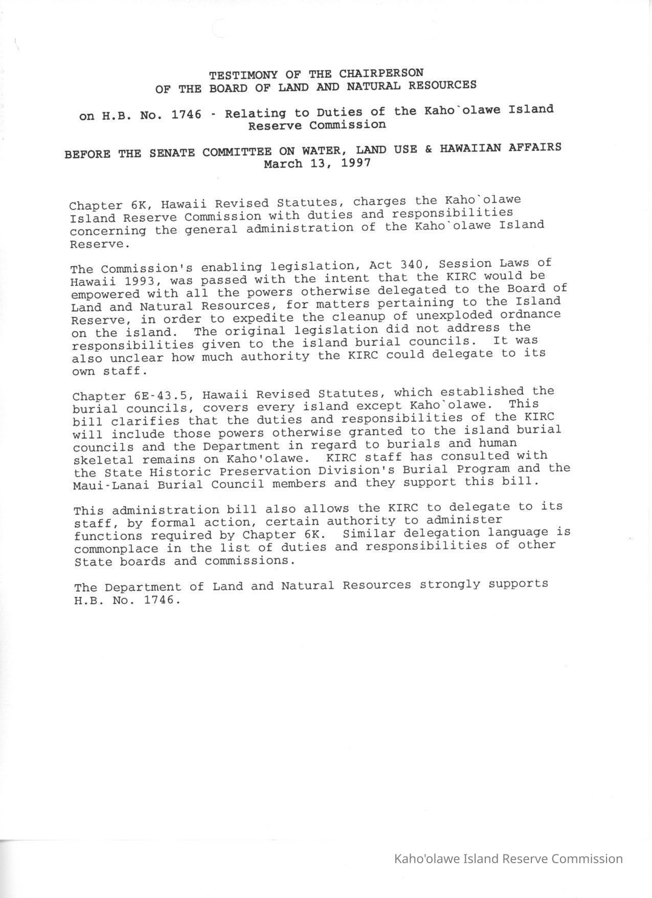 Testimony of the Chairperson of the Board of Land and Natural Resources on H.B. No. 1746-Relating to Duties of the Kaho'olawe Island Reserve Commission Before the Senate Commitee on Water, Land Use & Hawaiian Affairs.Date(s) of Creation