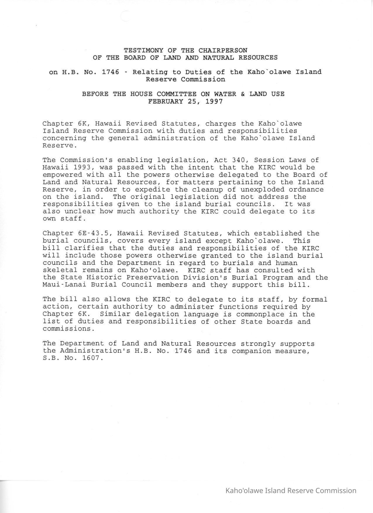 Testimony of the Chairperson of the Board of Land and Natural Resources on H.B. No. 1746-Relating to Duties of the Kaho'olawe Island Reserve Commission Before the House Committee on Water & Land Use.Date(s) of Creation