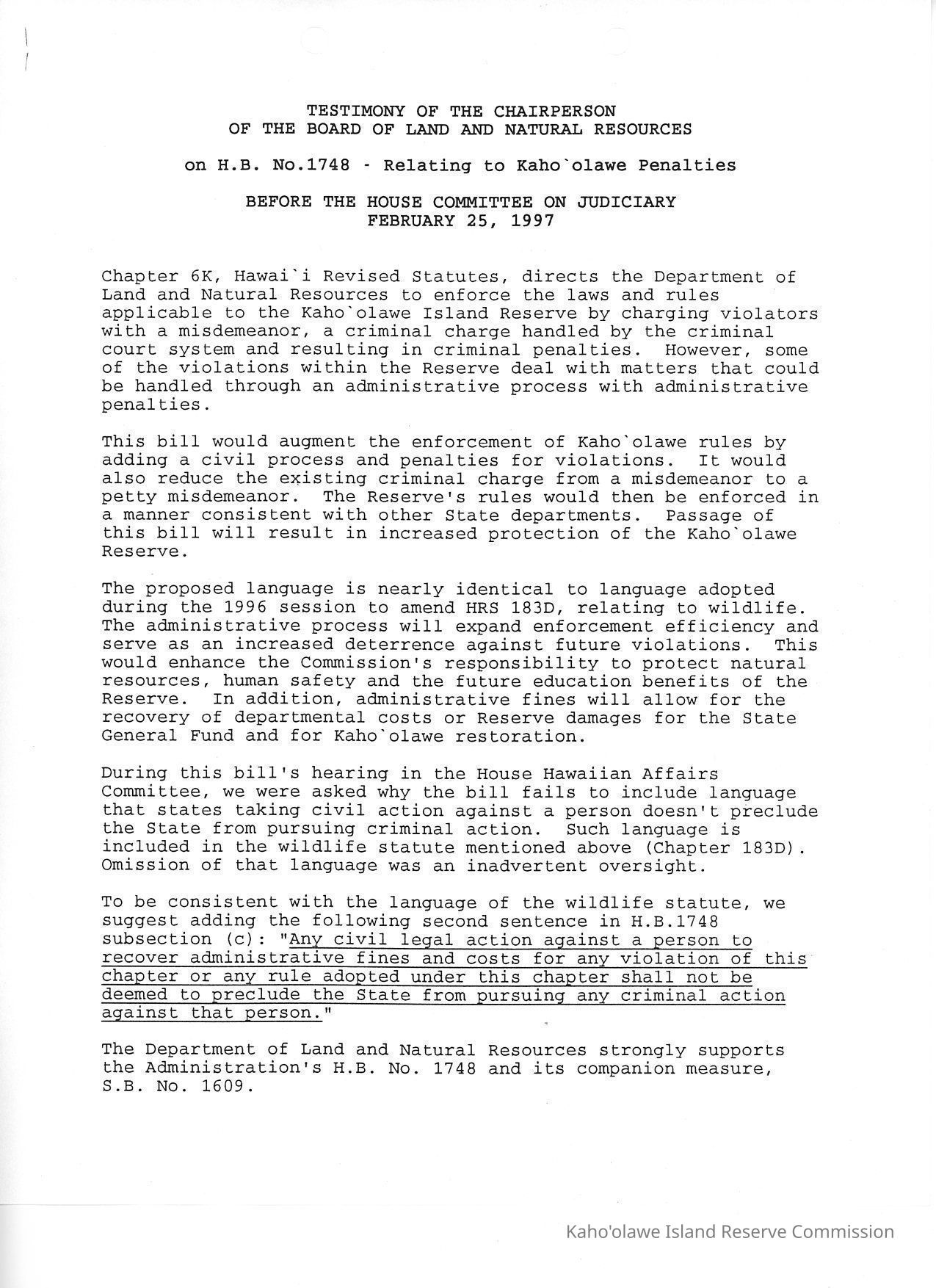 Testimony of the Chairperson of the Board of Land and Natural Resources on H.B. No. 1748-Relating to Kaho'olawe Penalties Before the House Committee on Judiciary.Date(s) of Creation