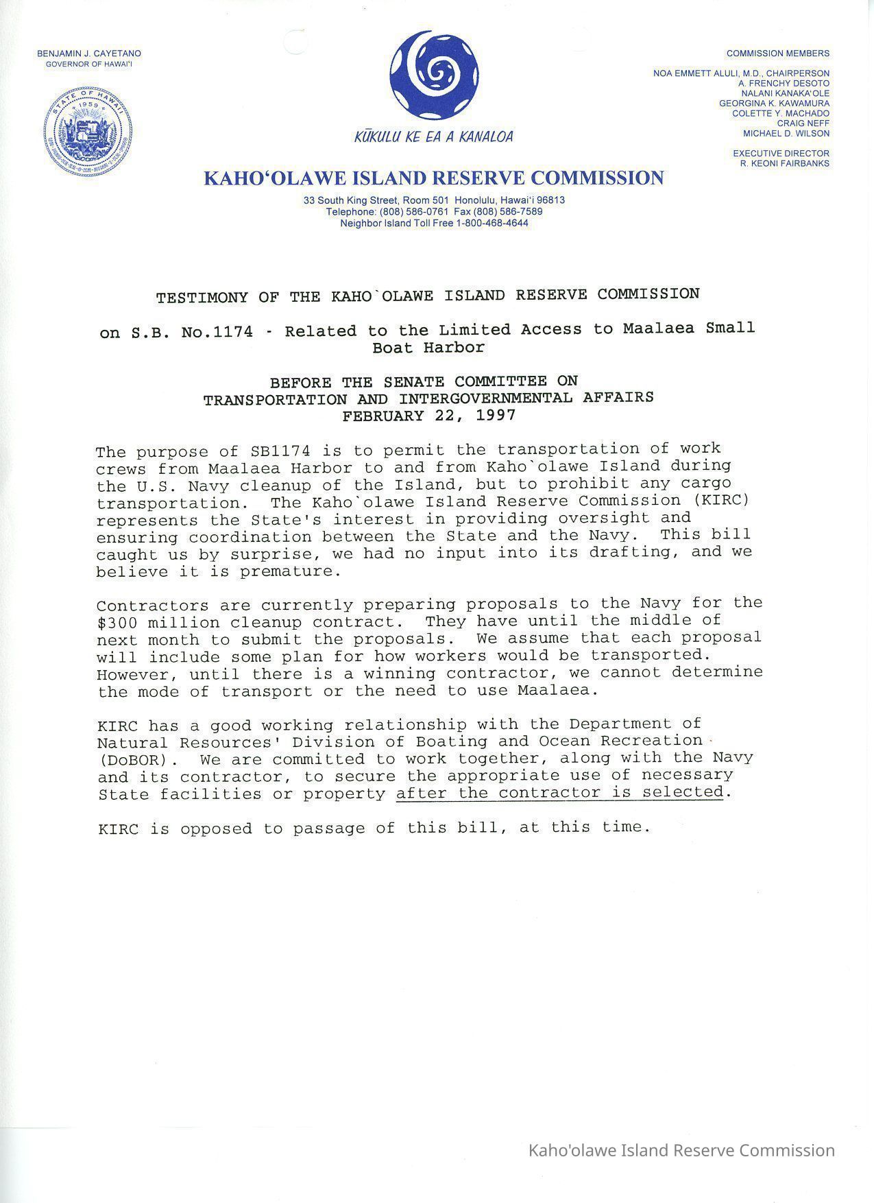 Testimony of the Kaho'olaweIsland Reserve Commission on S.B. No. 1174-Related to the Limited Access to Maalaea Small Boat Harbor Before the Senate Committee on Transportation and Intergovernmental Affairs, February 22, 1997.Creator