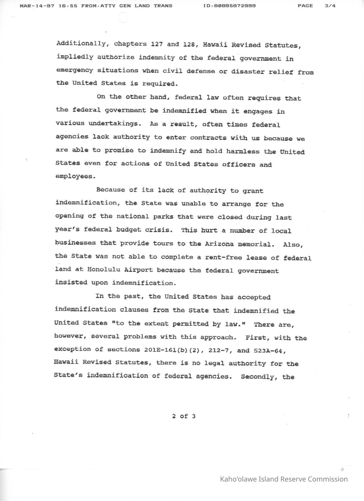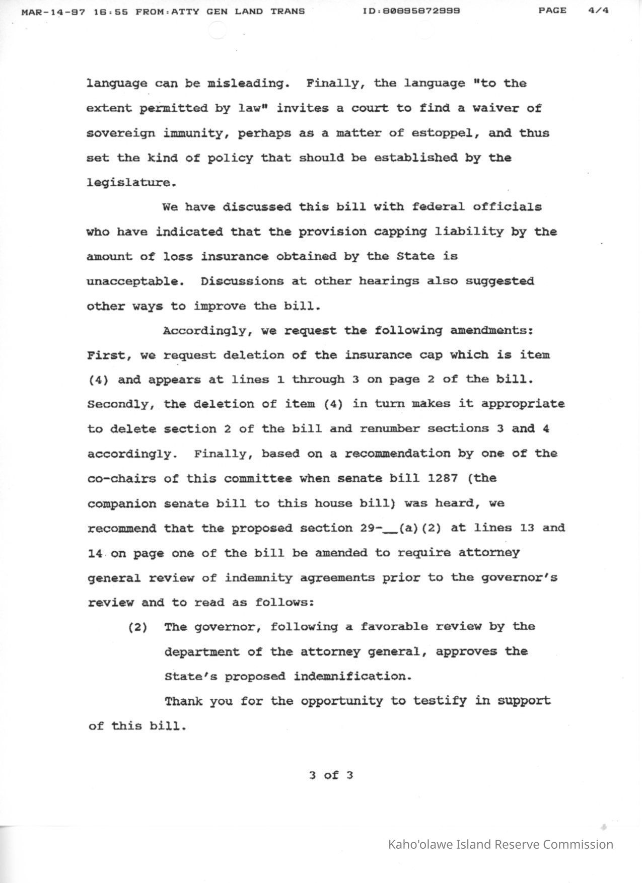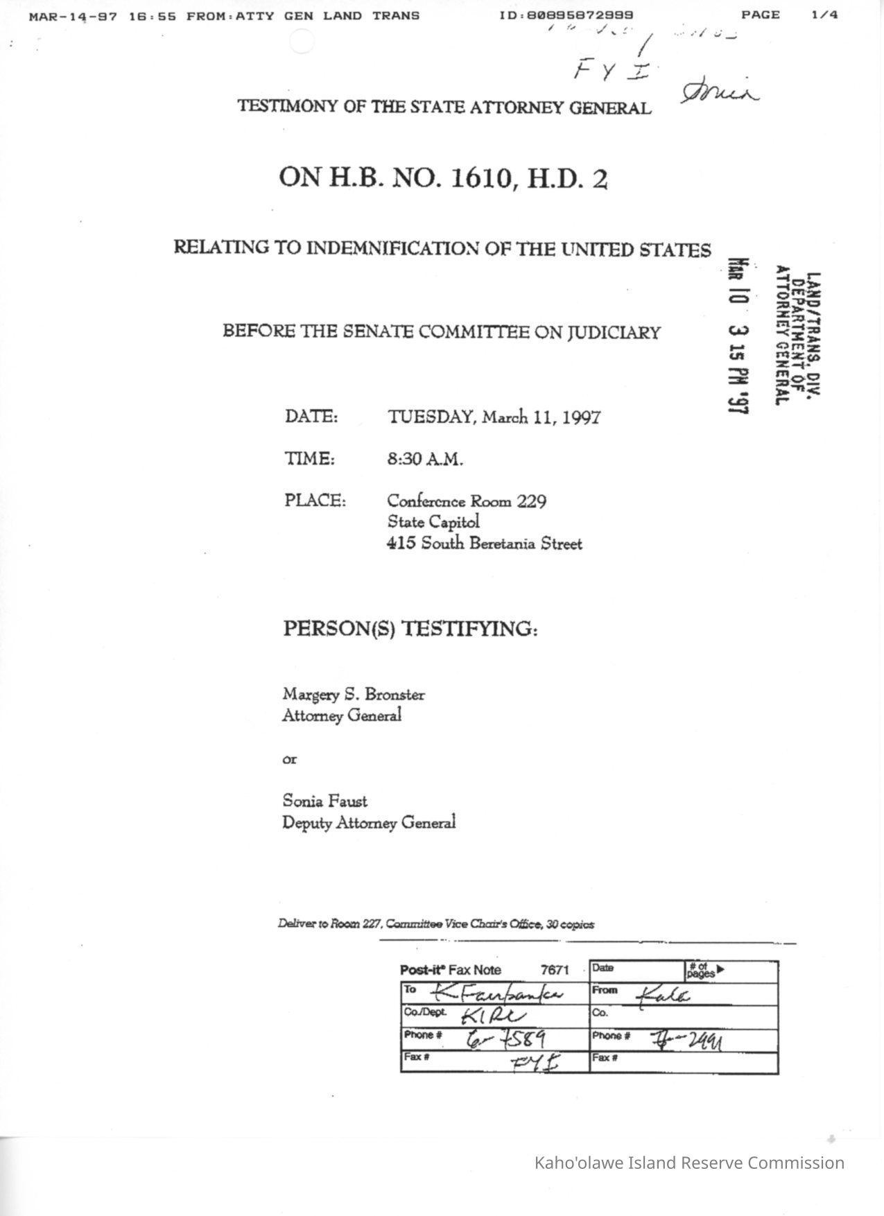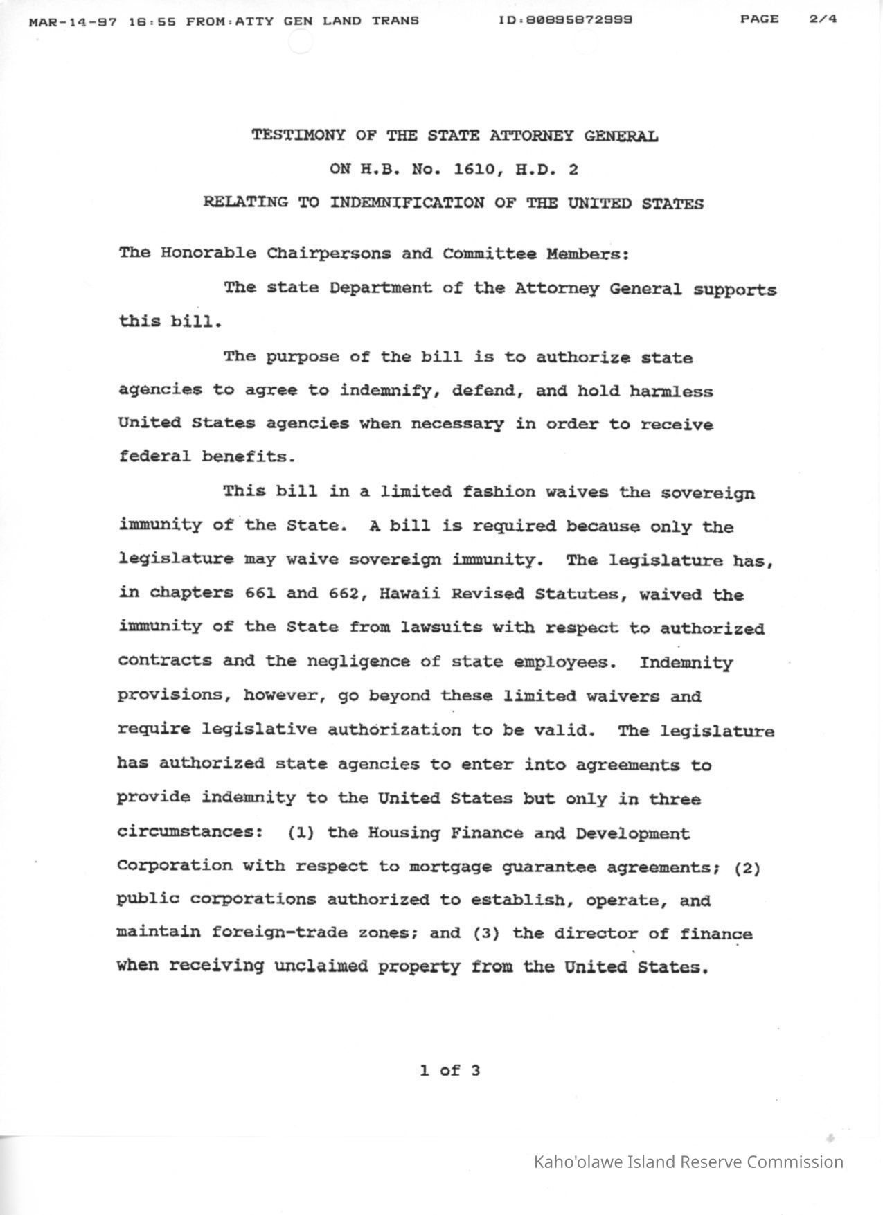 Faxed copy of Testimony of the State Attorney General on H.B. 10, H.D. 2, Relating to Indemnification of the United States Before the Senate Committee on Judiciary.Creator