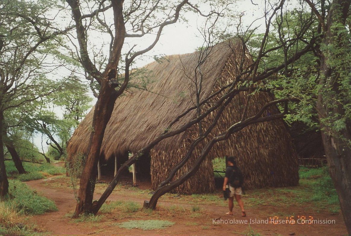 A person walks past a thatched-roof hut surrounded by lush trees and a dirt path in a natural environment.