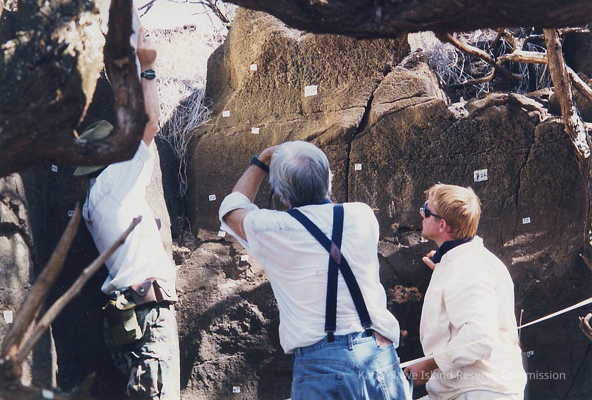 Color photo of three men examining grafitti and rock art at Kuheia. Left to right: - Rowland Reeve; unidentified, unidentifiedPhotograph Details