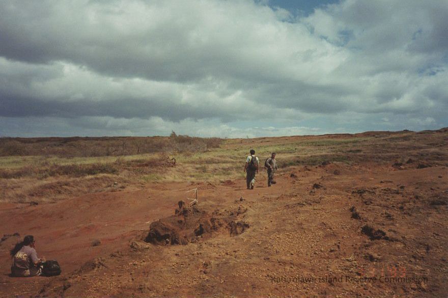 A photo of three people in the Luamakika area: Kalei Tsuha (Nuuhiwa)-sitting, Paul Higashino-walking in the middle of the picture and an unidentified man.Photograph Details