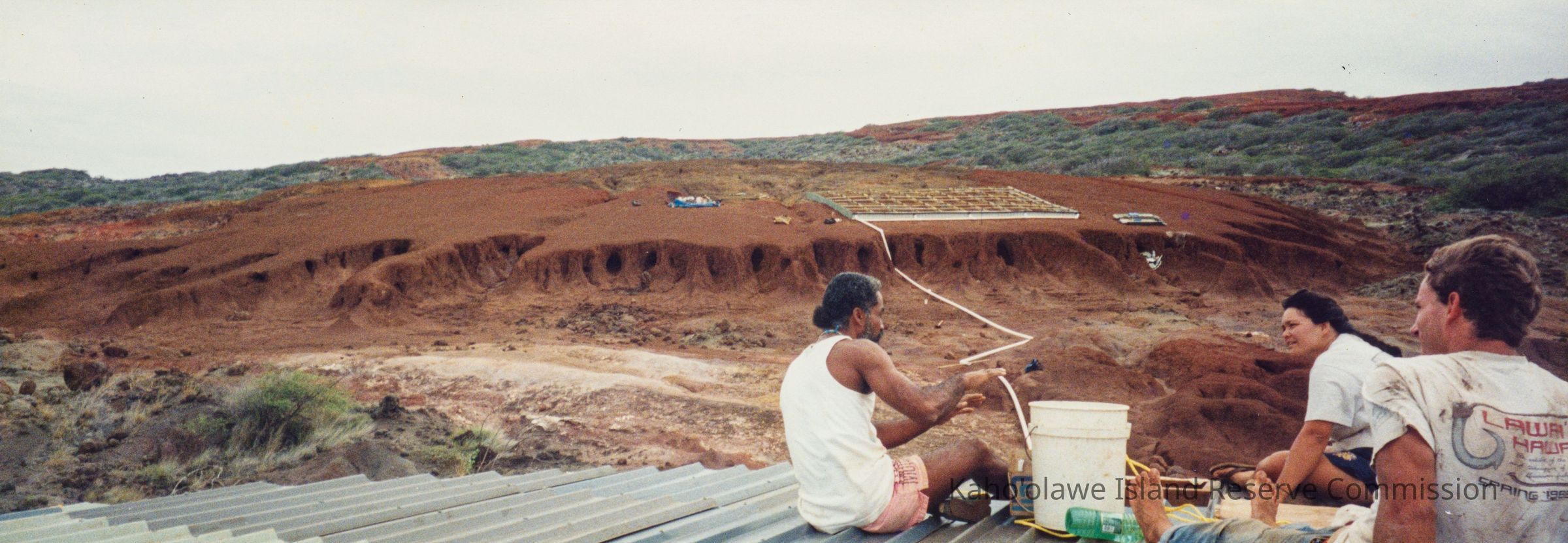 Three people are sitting on a corrugated metal roof, observing a water catchment structure in a hardpan landscape.
