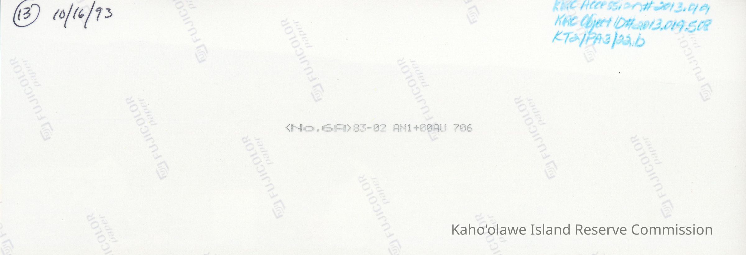 A color panoramic photograph of three unidentified people sitting and talking while overlooking a hardpan gully and the base of a water catchment structure with white PVC (polyvinyl chloride) piping attached to it. The number "13" and 10/16/93 was handwritten in black ink on the back.