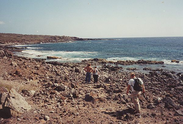 Color photo of three unidentified people walking along a rocky shoreline in an unidentified area.Collection