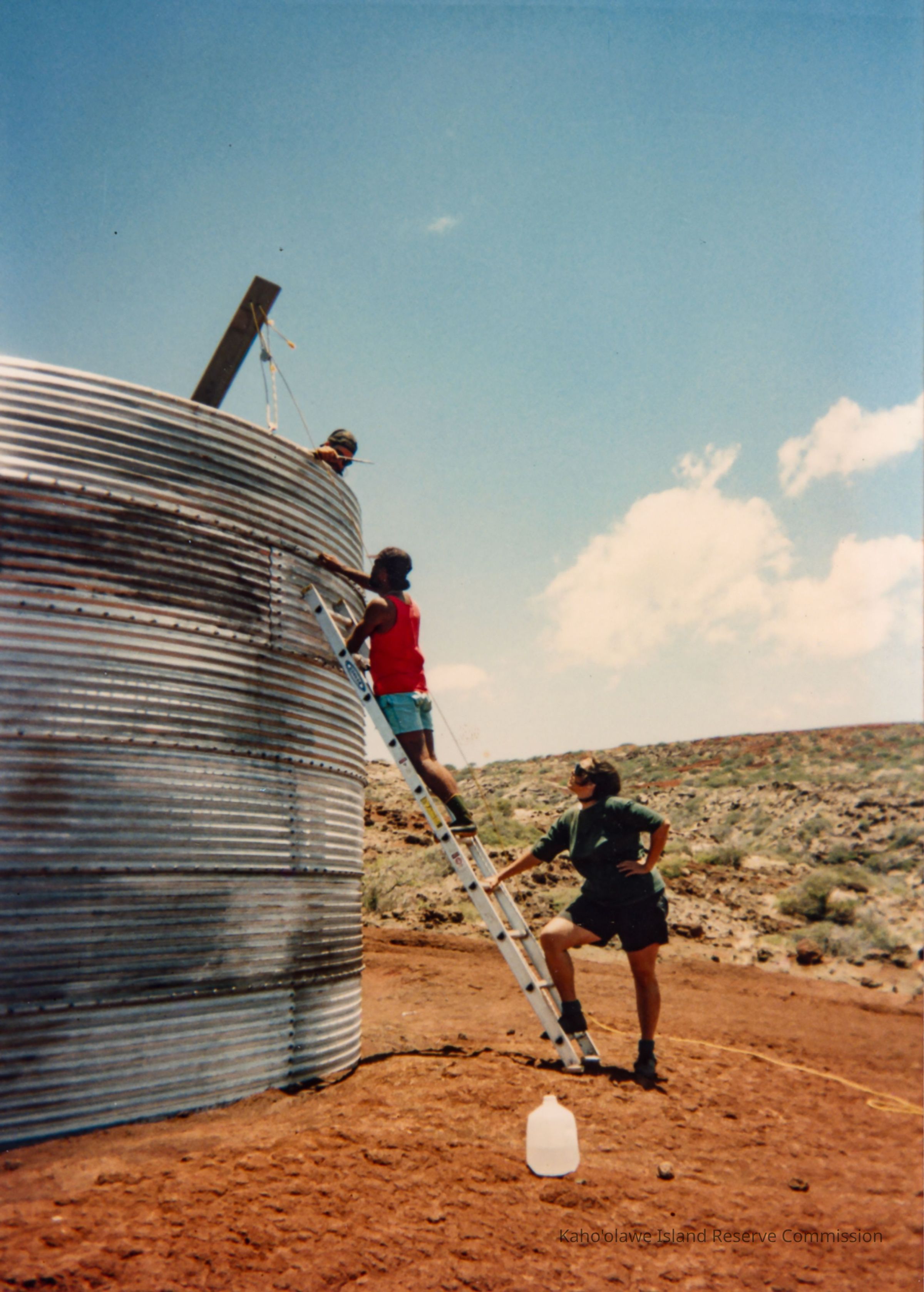 Color photo of three unidentified people working on a water catchment structure. A woman is supporting the ladder. One man is standing on the ladder and working on the outside of the structure. There is also a man working on the inside of the structure. This photo was probably taken during the 1993 PKO (Protect Kaho'olawe 'Ohana) access to build a water catchment.