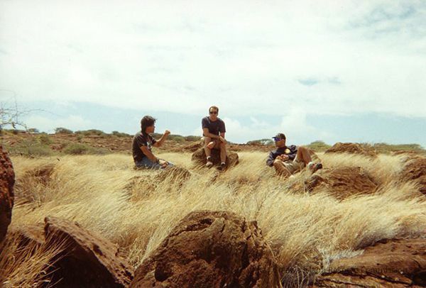 Three unidentified men sitting on pohaku (stones)Entry/Object ID