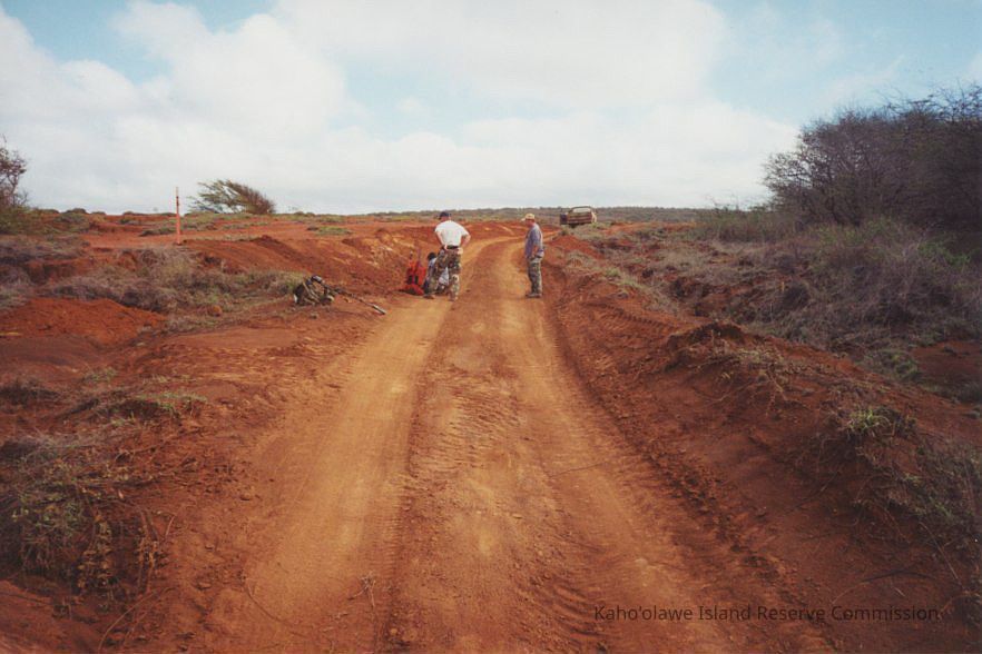 Three individuals are working on improving a dirt road flanked by wild shrubs and a clear sky.
