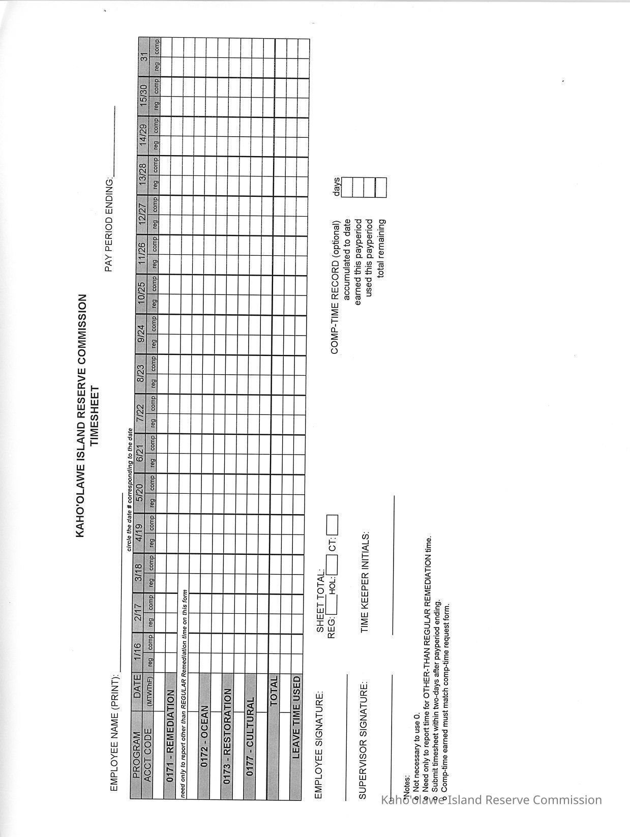Kaho'olawe Island Reserve Commission Timesheet blank form .Creator