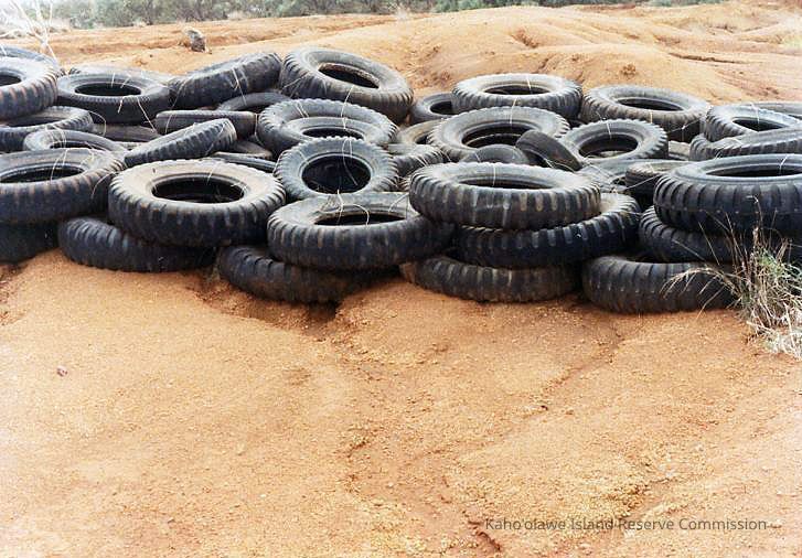 Color photo of a large group of vehicle tires lying on hardpan in an unidentified area.