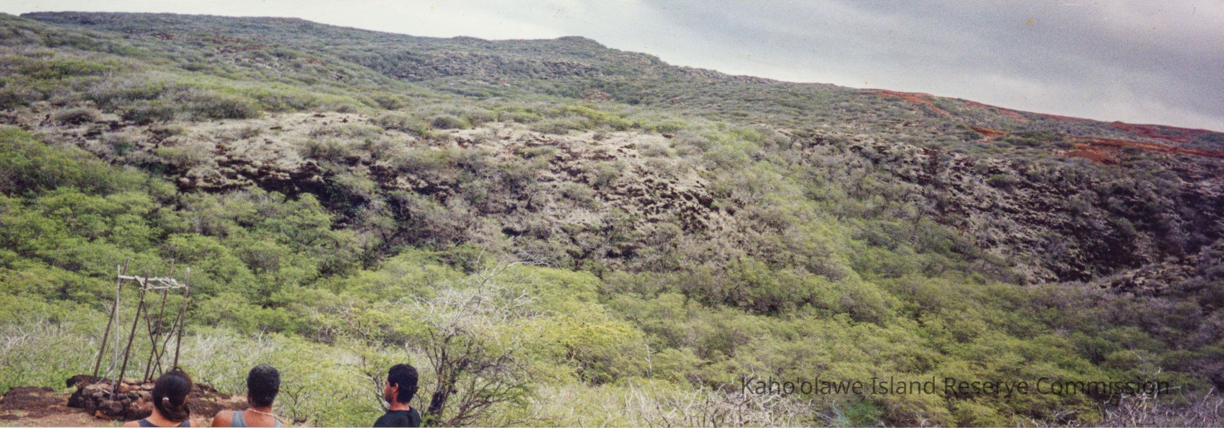 Color panoramic photograph of landscape with trees, ledge and hills in the background. There is a platform made of wooden branches sitting atop a stacked stone platform with three unidentified people looking at it in the forefront.
