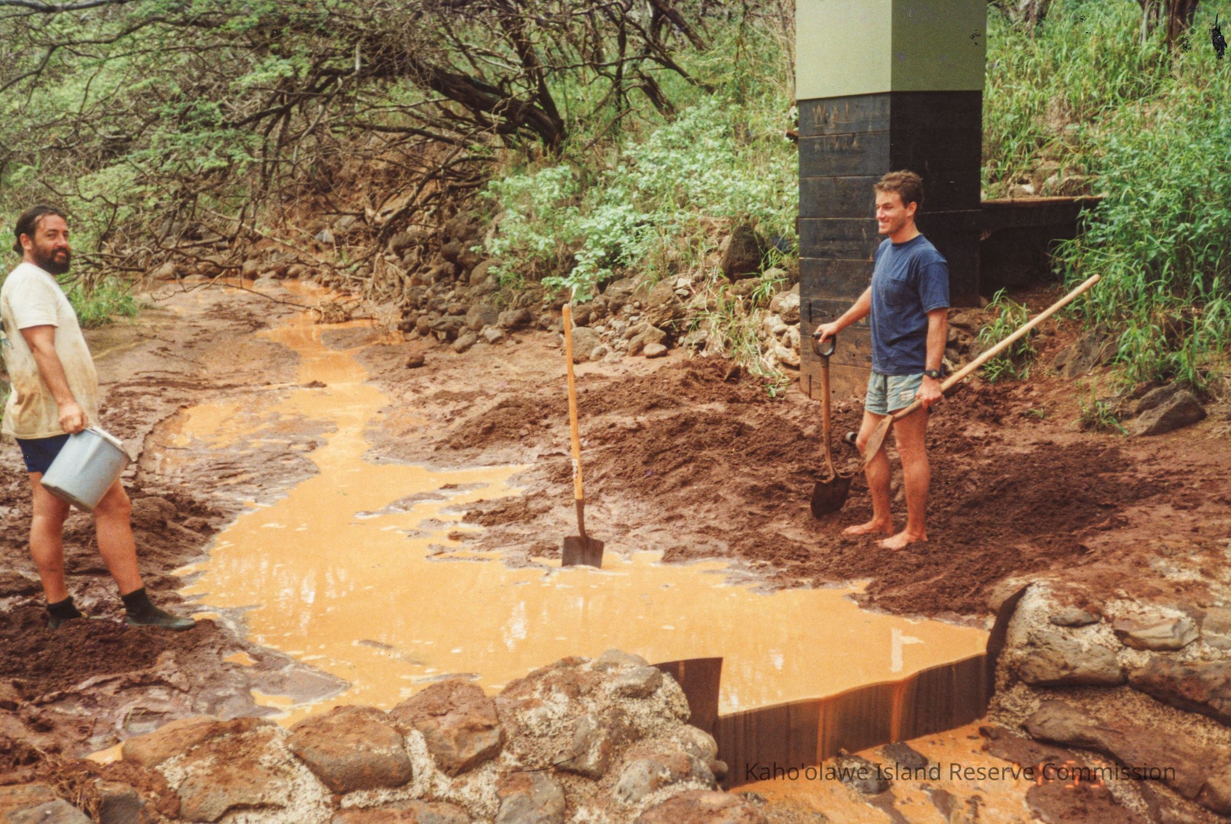 Two men (left to right: Dan Holmes [possibly] and Marc Hodges [possibly]) standing on either side of a small stream (possibly Hakioawa Stream). Mr. Holmes holds a bucket and looks at the camera while Mr. Hodges holds both a shovel and a spade. The stream is dammed at the bottom of the photo.