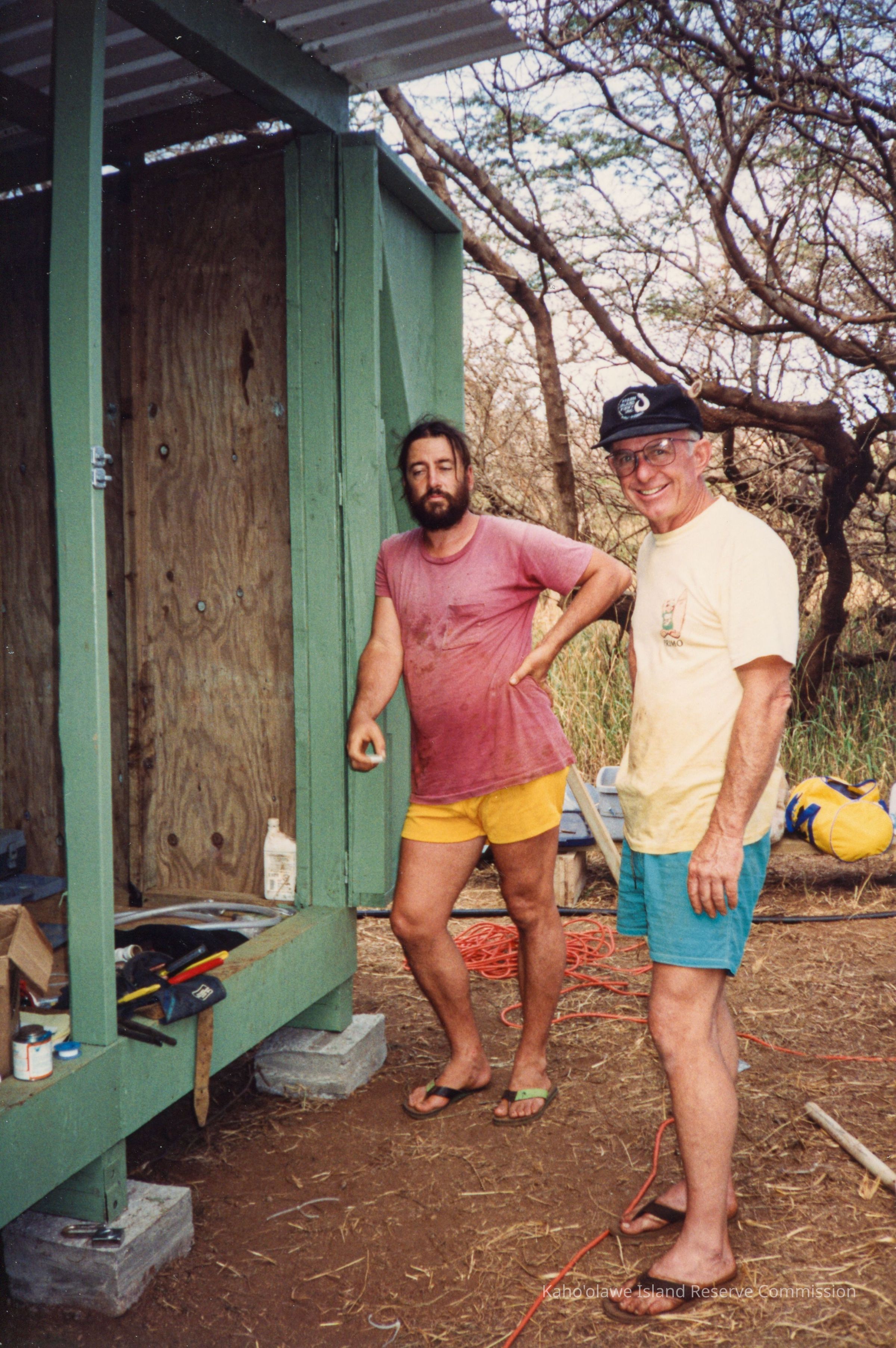 Color photo of two men (possibly Dan Holmes on the left and unidentified) standing near an irrigation shed on concrete pylons. This photo may have been taken in Hakioawa.