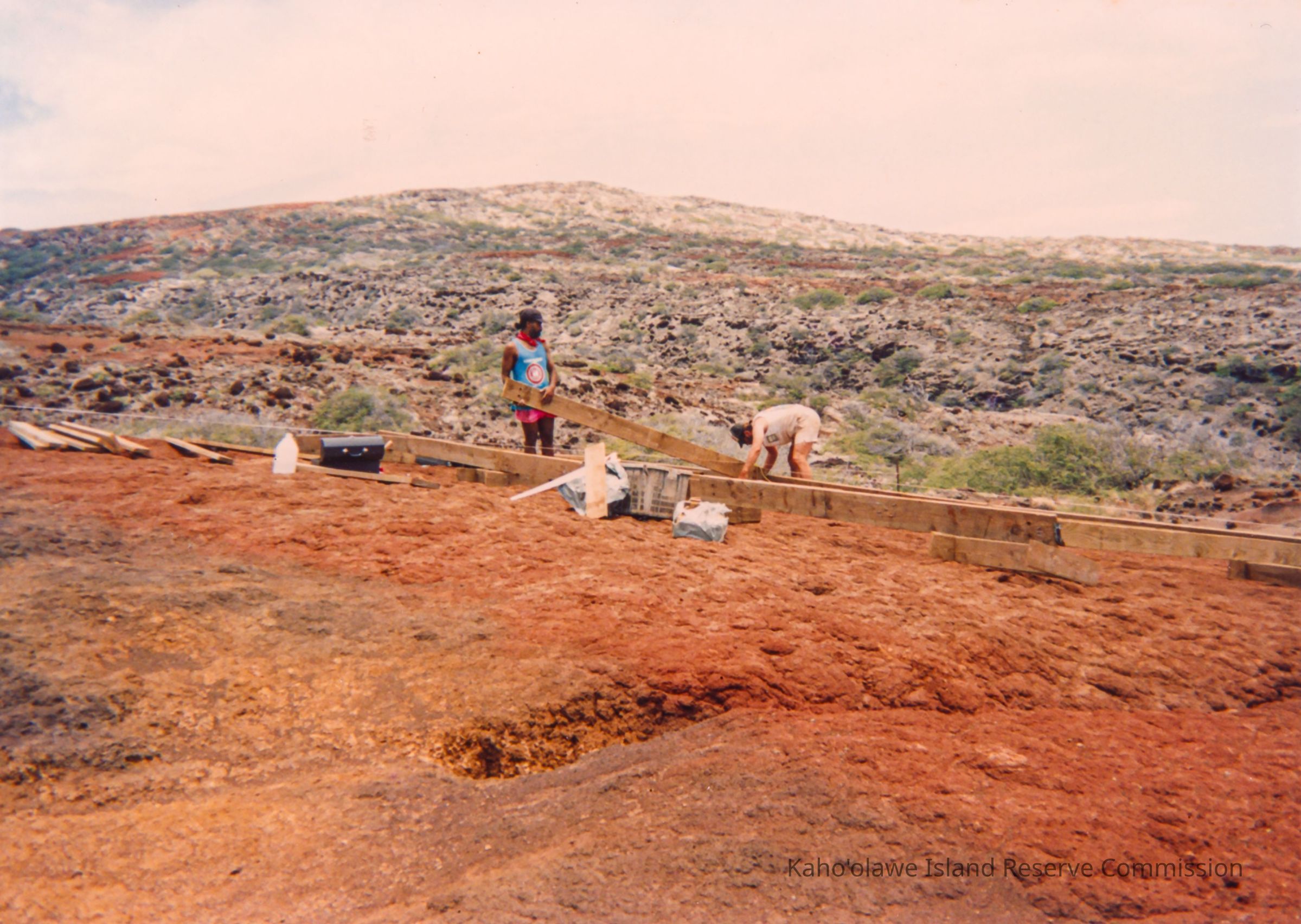 Two men working on a wooden structure in a rugged, red terrain with sparse vegetation in the background.