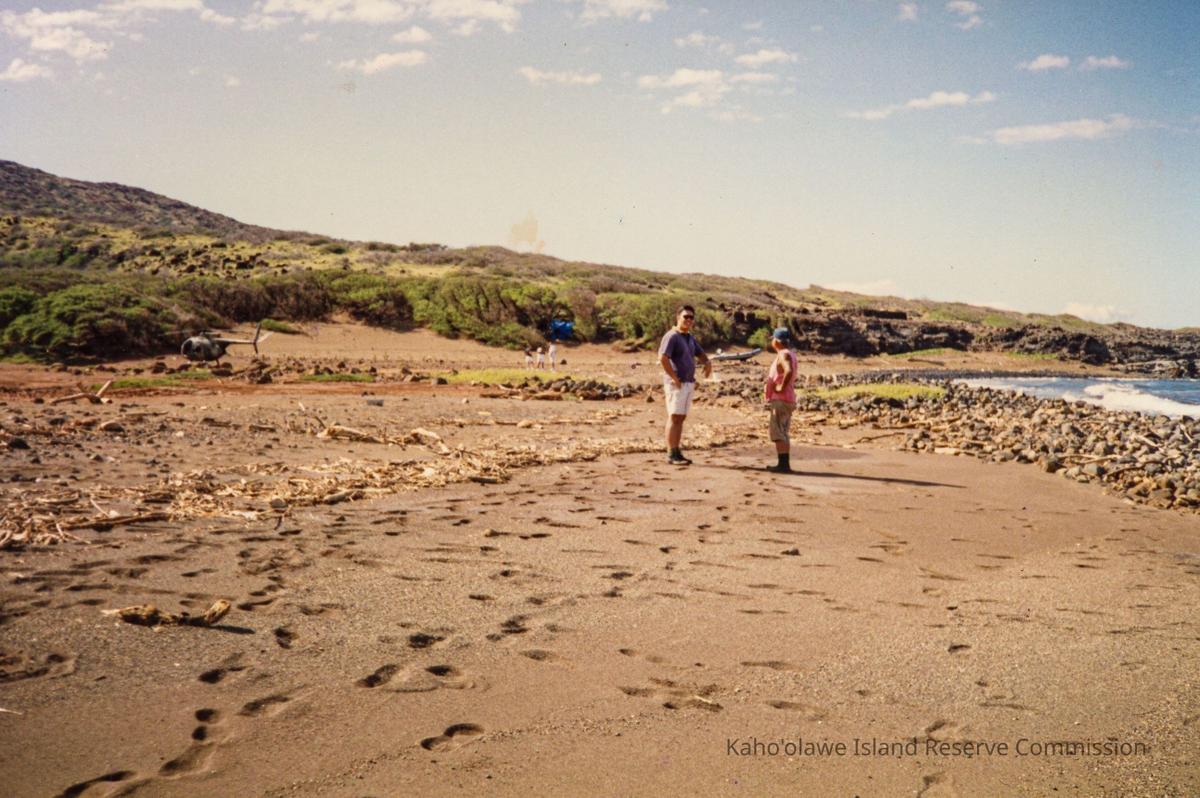 Two men (left to right Michael Naho'opi'i and unidentified) standing on a semi-rocky, sandy beach (probably Hakioawa). There is a helicopter in the background and a group of unidentified people in the very far background.